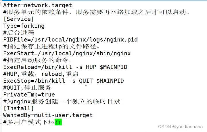 Type: 指定服务的类型,这里是forking,表示服务是一个后台进程(通常是fork出子进程)。
