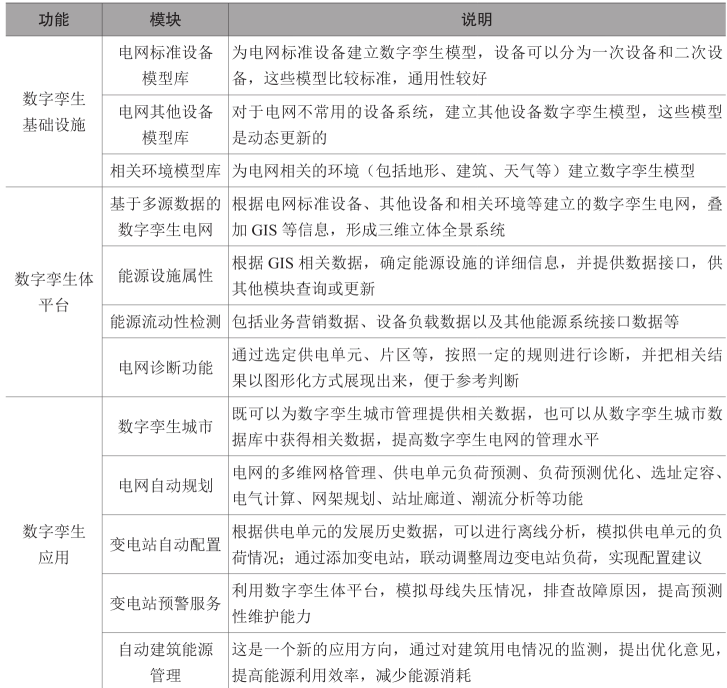 数字孪生电网是建立在物理系统在数字空间的数字孪生模型基础之上的,它既可以承载历史数据,还为物理系统和数字孪生模型之间的数据同步提供了前提。历史数据可以帮助数字孪生电网平台进行离线分析,为其运行提供更有效的建议;实时数据同步可以为电网的实时控制提供方便,这可以大大提高电网的运行效率,也可以满足更丰富的应用场景需要。数字孪生电网的主要功能模块见表