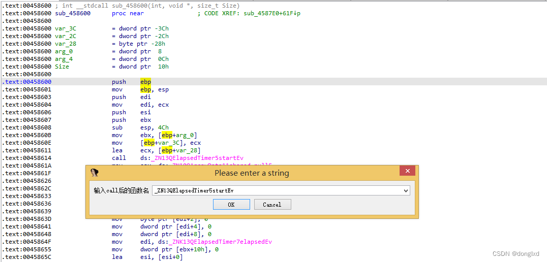 在弹出的对话框中,输入需要查找的StartTimer函数(_ZN13QElapsedTimer5startEv)