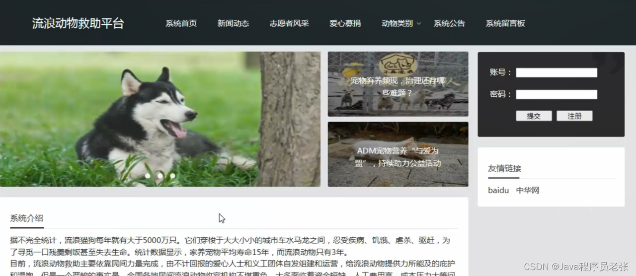 流浪动物救助平台首页信息主要包括了流浪动物救助的相关新闻动态、志愿者介绍、爱心募捐平台以及动物类别信息,用户通过首页的动物类别可以查看到需要救助的动物信息,需要通过界面右侧的登录窗口实现注册登录后系统部门功能内容才可以正常使用,包括申请志愿者、爱心募捐及动物收养申请等,流浪动物救助平台的首页内容呈现如下图所示: