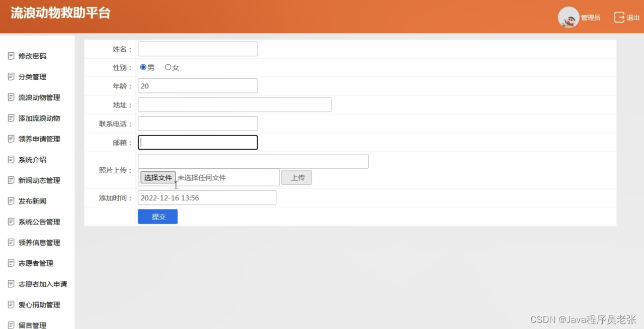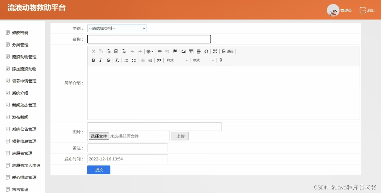 通过流浪动物信息添加可以选择对应流浪动物的类别信息(猫或狗),流浪动物名称,流浪动物简介以及对应的流浪动物图片,同时可以结合备注信息的添加来帮助用户更好的了解流浪动物,同时结合领养信息反馈当前流浪动物的领养状态,具体流浪动物信息添加界面内容呈现如下: