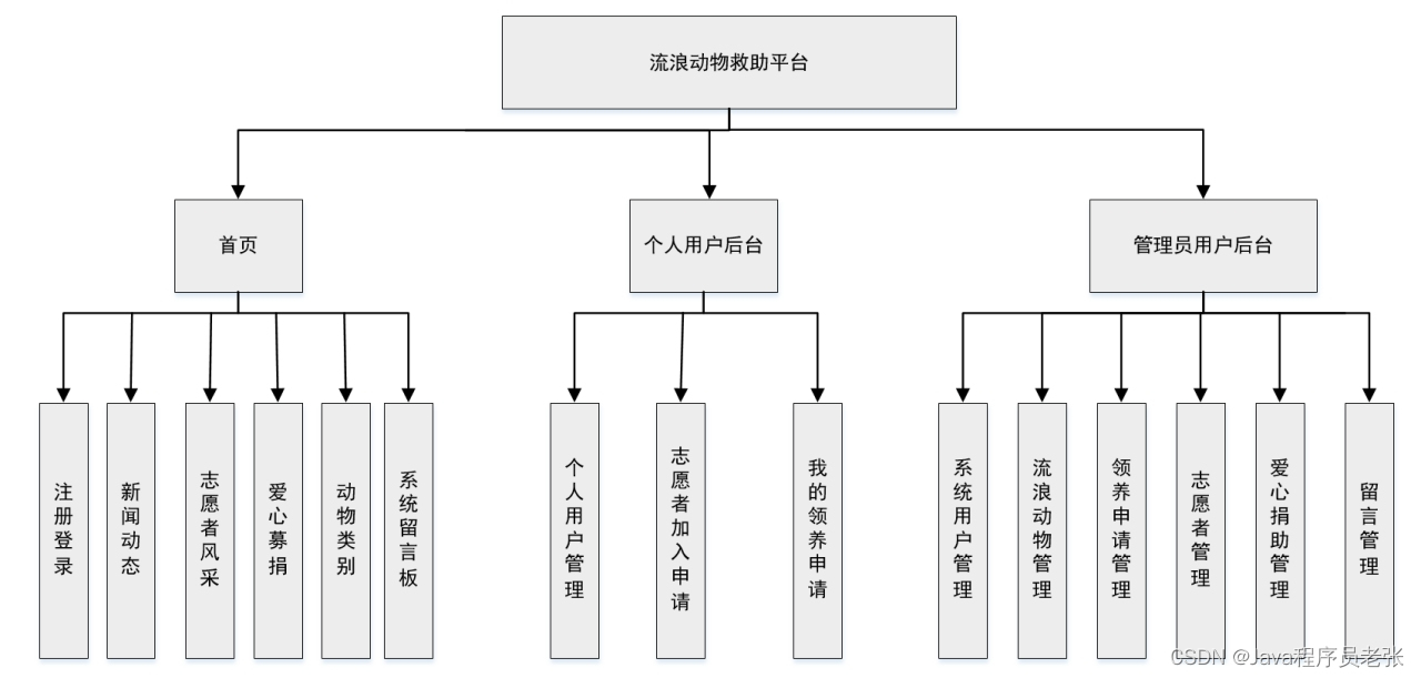 流浪动物救助平台的主要功能需求集中在流浪动物信息提供、用户在线领养流浪动物、志愿者申请以及爱心捐助在线支付,按照用户功能角色可以分为前端用户和后台管理人员,通过流浪动物救助平台首页可以为用户提供流浪动物救助的相关新闻信息,用户通过注册登录进入到系统平台后可以实现在线的领养申请以及爱心募捐,平台同时提供了流浪动物的相关信息,为了便于用户端的信息查询按照猫狗类别进行划分,结合流浪动物的基本信息以及领养状态用户可以实现在线的申请,利用爱心募捐平台可以实现在线的扫码支付,可以录入对应的募捐金额通过扫码的方式实现微信支付或者支付宝支付。个人用户可以通过个人后台查看到领养申请的相关审核状态,通过可以通过后台实现志愿者的申请加入,管理员用户对于首页的流浪动物信息内容进行添加和管理,通过时可以通过后台查看到前端用户的申请和募捐内容进行及时的维护管理,为了便于理解用户需求的主要结构图内容呈现如下: