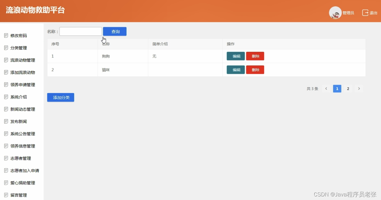 管理员用户可以通过系统后台实现个人登录信息的修改,同时可以通过后台管理维护首页的基础信息,包括流浪动物分类管理、添加流浪动物信息、领养申请管理、首页新闻及公告信息、志愿者加入申请管理以及爱心捐助管理,管理员用户利用系统后台可以对于前端用户的申请和捐助信息进行管理和维护,具体系统后台界面呈现内容如下图所示: