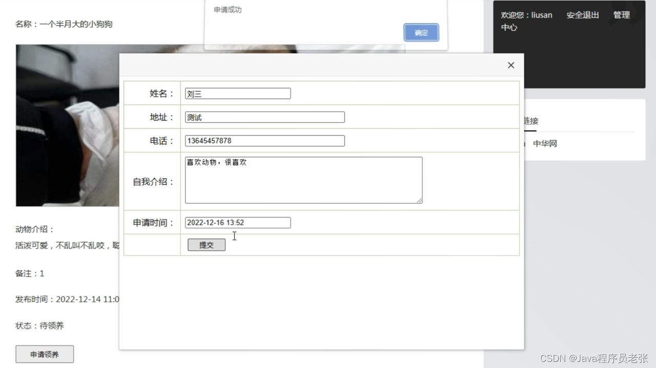 用户通过动物类别进行相关动物信息的查看,动物介绍界面包括了动物名称、动物基本信息以及当前领养状态等内容,用户通过点击领养申请可以进入到在线申请界面,动物领养需要提交的信息包括了领养人姓名、联系地址、联系电话以及简单的自我介绍,同时领养申请还包括了申请时间,通过以上信息的提交来实现领养申请。