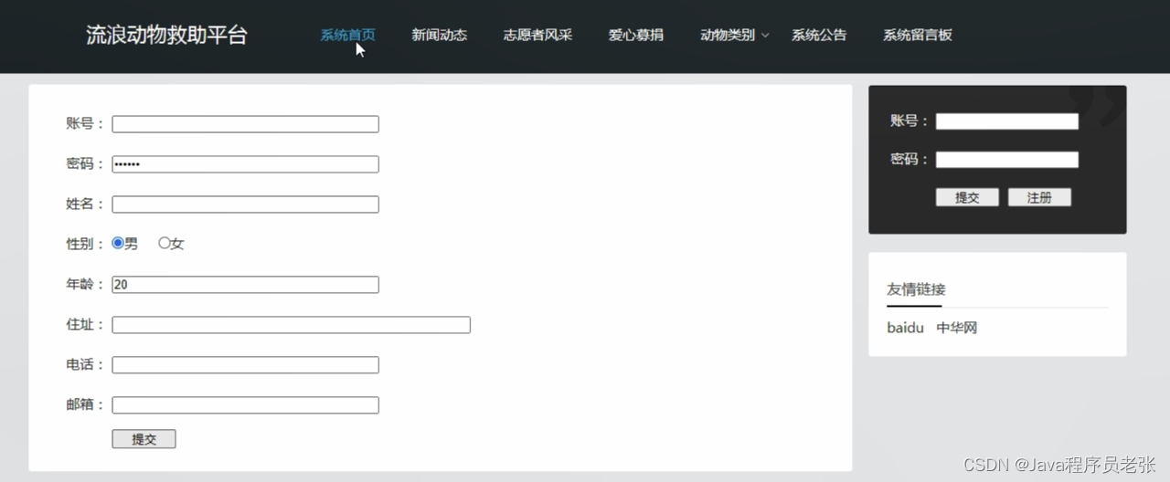 用户注册界面需要用户在网页平台提交登录账号及密码信息,同时还包含了用户的基础资料,包括姓名、年龄、住址及联系电话等内容,因流浪动物救助平台包含了爱心募捐以及领养申请等内容,需要登录后才可以实现功能的使用。