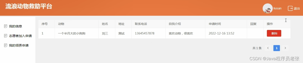 用户登录进入平台后可以通过个人后台来查看和修改个人资料,同时个人后台好包括了志愿者申请及领养申请的数据信息,结合后台可以查看到相关申请的结果反馈,同时可以利用后台实现相关申请的删除,具体用户个人后台界面呈现内容如下: