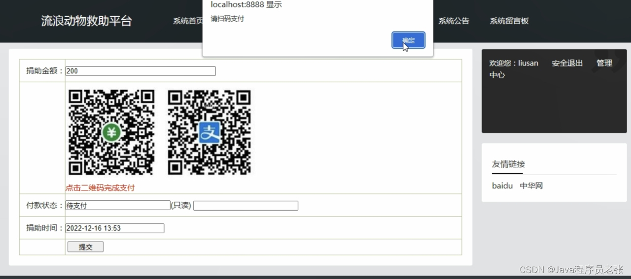 用户可以通过首页的爱心募捐窗口来实现对流浪动物的爱心捐助,可以通过录入对应的捐助金额以及点击对应的微信或支付宝二维码收款码来实现付款,结合付款状态以及对应的金额来判断是否完成捐助。