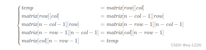 然后再说正常人解法:观察矩阵(请自行在草稿纸上进行推导),选取矩阵中任意一个点,发现其四次旋转后回到原点,对于题目中不让用额外的矩阵空间所以我们没法解决matrix[row][col]=matrix[col][n-row-1]被覆盖的问题,又因为矩阵上某四个点为一循环,所以我们只需要一个变量来记录其中被覆盖的值完成这个循环即可。
