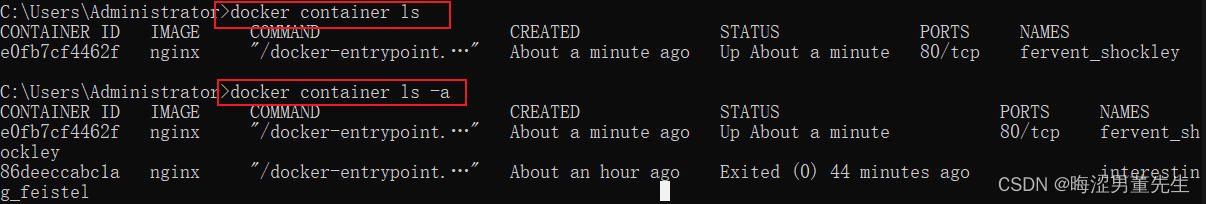 - "docker container ls"只显示正在运行的容器,这对于快速查看在主机上正在运行的容器很有用。