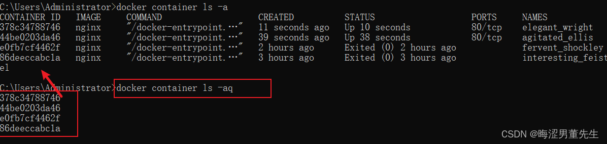 "docker container ls -a":这个命令使用了"-a"参数,意为"all",表示列出所有的容器,包括正在运行的容器和已经停止的容器。它会显示所有容器的列表,包括已停止容器的信息。