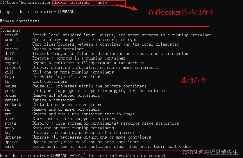 通过在cmd--> docker container --help
