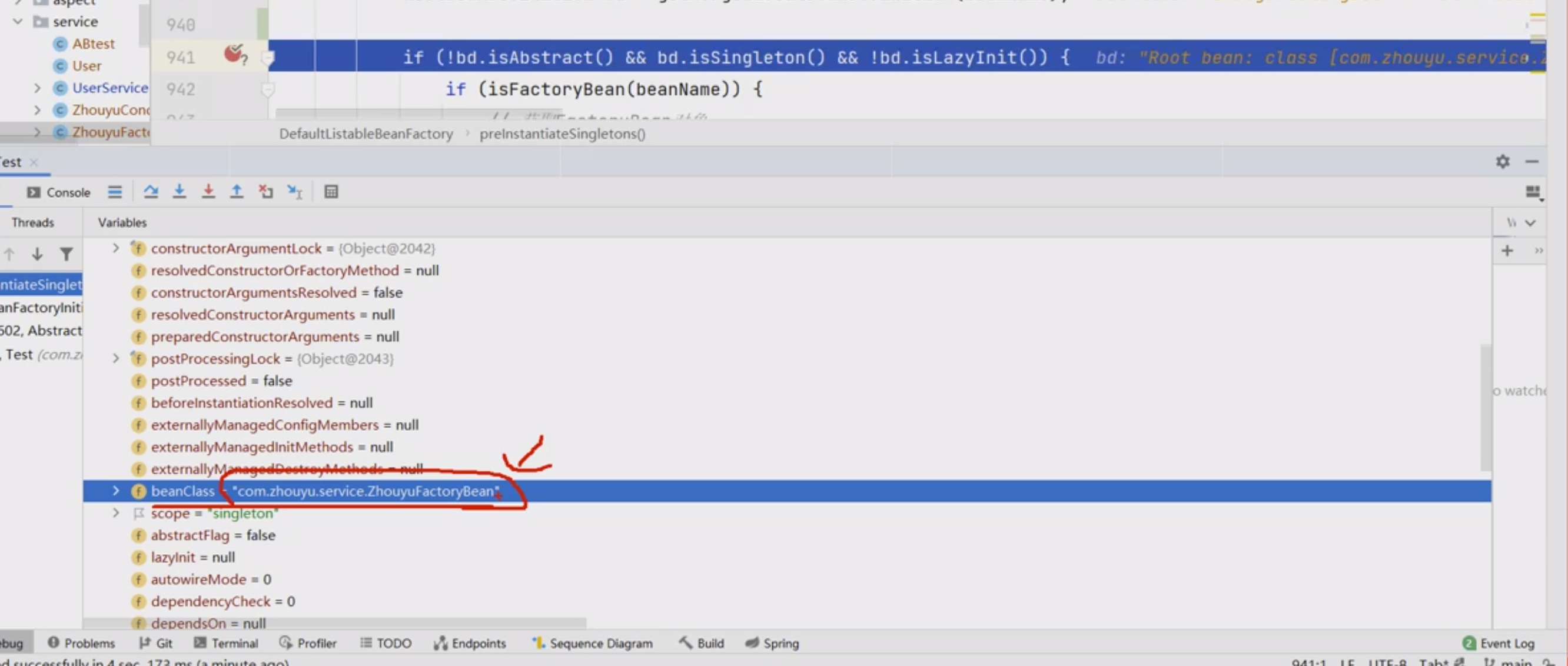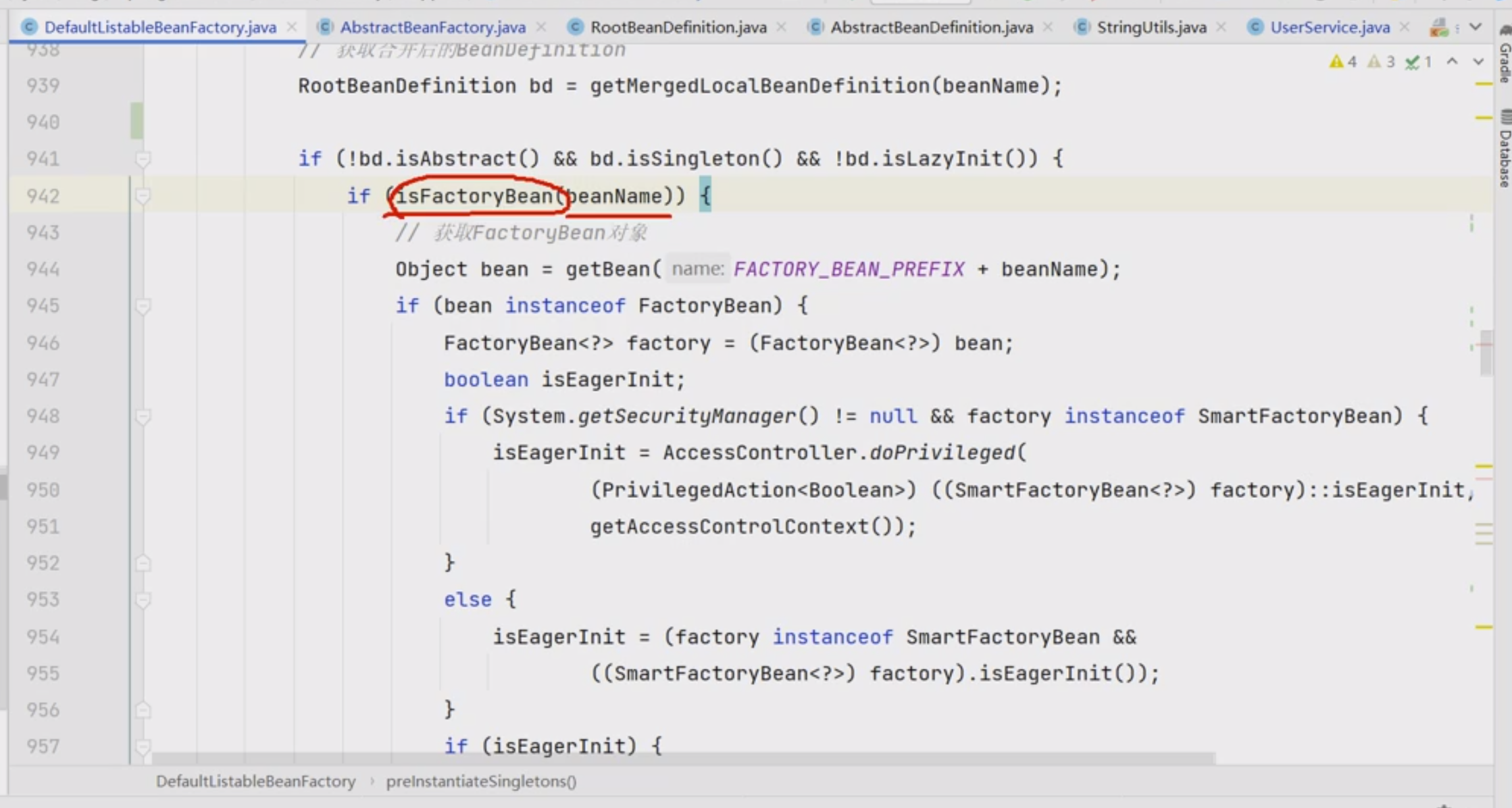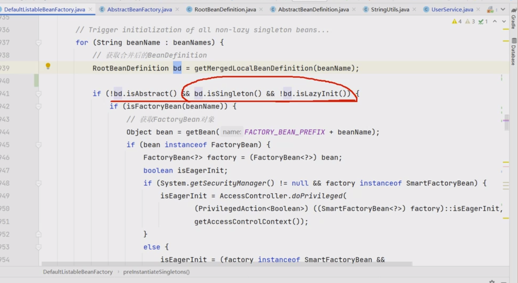 接下来判断BeanDefinition是不是单例,是不是非懒加载,是不是非抽象的BeanDefinition才会进if
