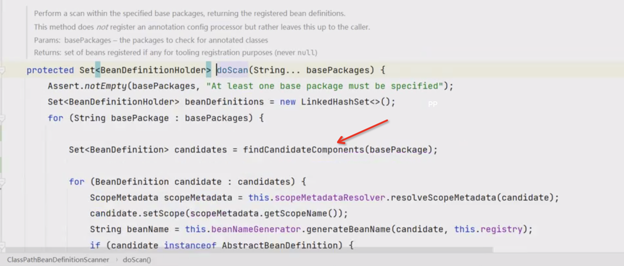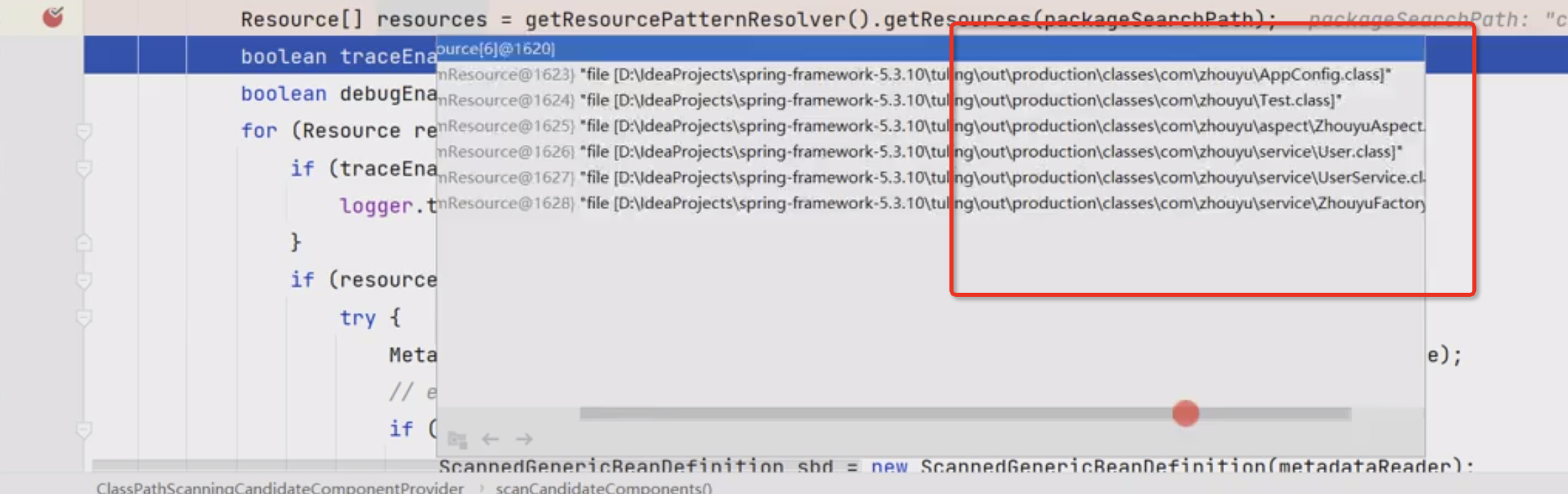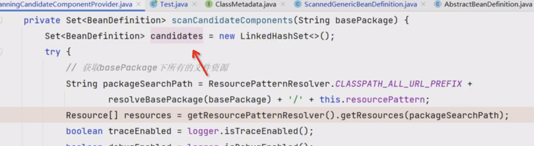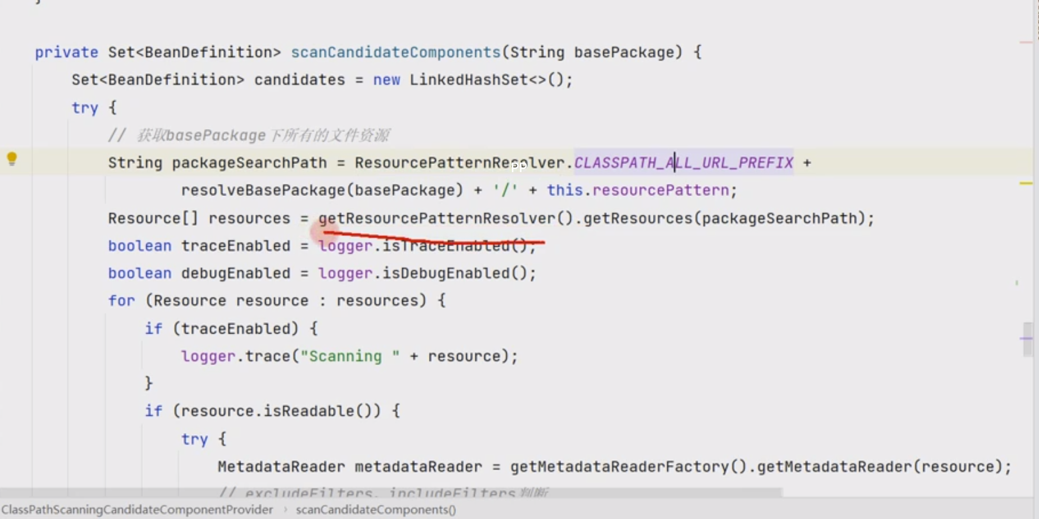 根据包路径会拼接一些"classpath*:" + 包路径 + "/**/*.class",然后根据ResourcePatternResolver工具类去获得资源。