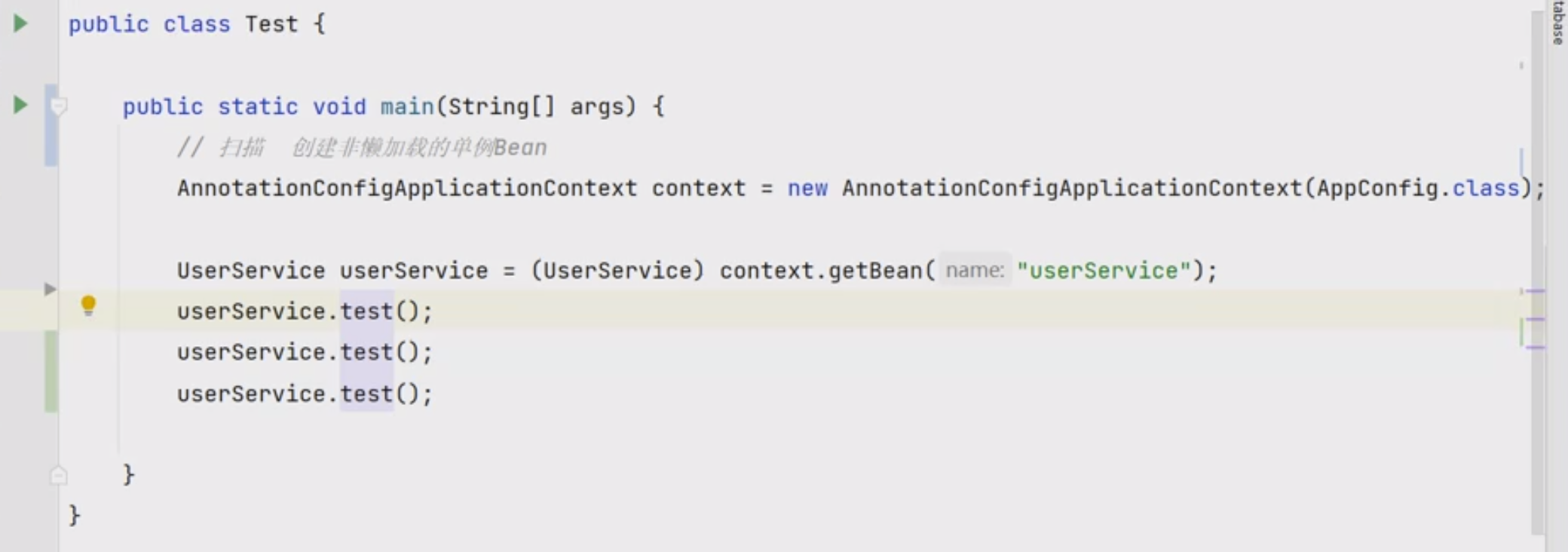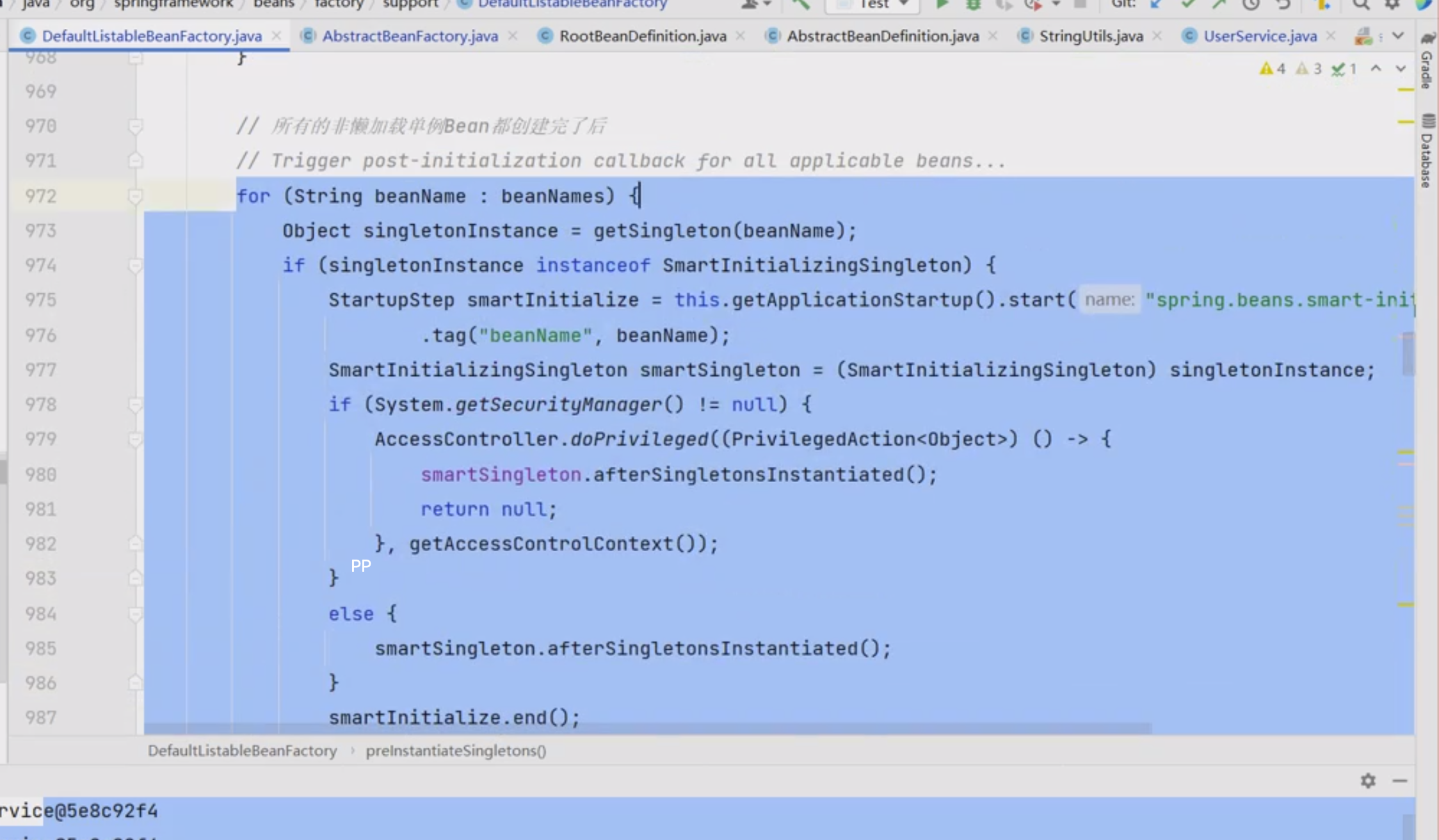 ===》所有的非懒加载单例bean创建完之后,又会遍历每个bean的名字也就是beanName,getSingleton()找出所有的单例bean对象接下来判断单例bean对象是否实现了SmartInitializingSingleton接口,如果实现了则直接调用afterSingletonsInastantiated()方法【区别:容器所有的非懒加载的单例bean创建完之后,才会一个个调用每个单例bean的afterSingletonsInstantiated()方法,而之前的那些是每个单例bean在创建的过程中会执行的】