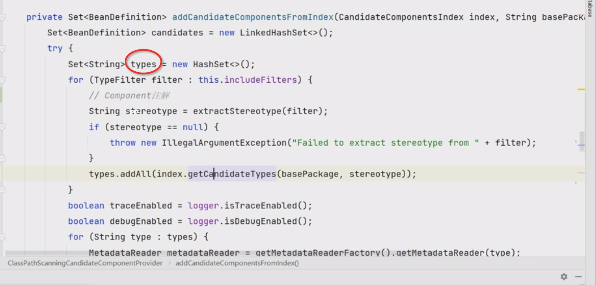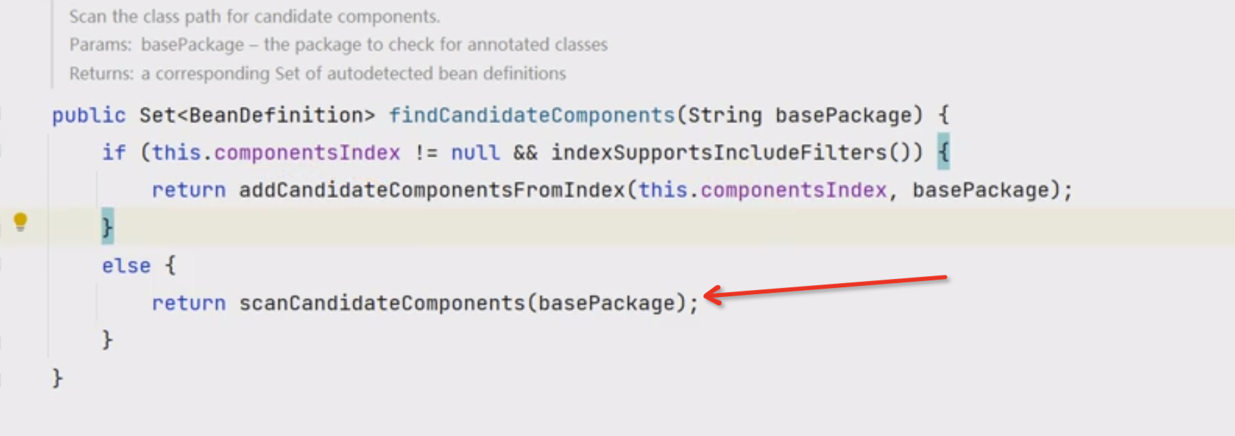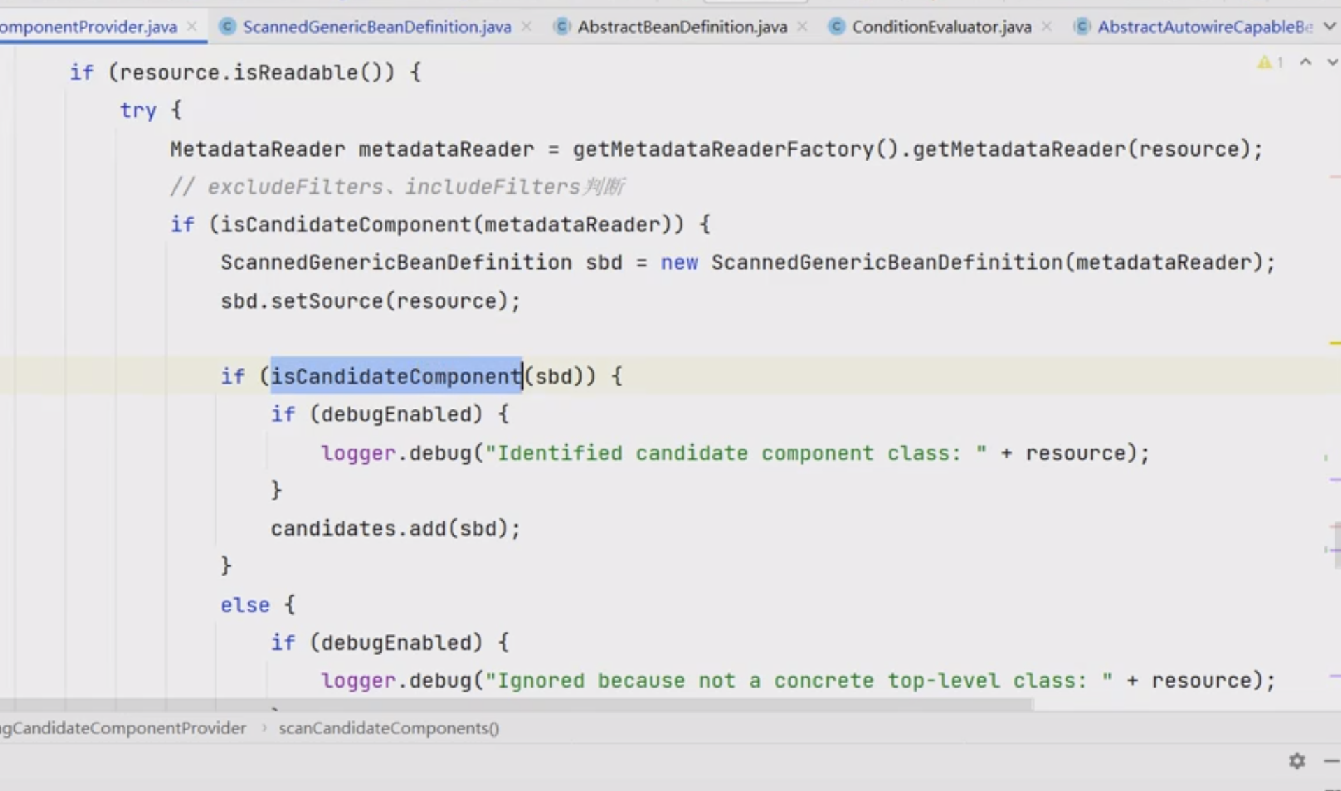 扫描(addCandidateComponentsFromIndex)/(findCandidateComponents)==》拿到所有指定扫描路径下的Resource资源数组(里面都是一个个class文件,Spring源码中将此文件包装成了Resource对象)===》传入Resource获取类的元数据信息===》是否匹配排除过滤器===》是否包含include过滤器(ManagedBean/Components)===》条件匹配(是否有@Conditional注解,调用match方法)==》符合构造sgbd(ScannerGenericBeanDefinition)把注解的元数据赋值metadata,还会设置Resource资源文件,把class这个对象赋值给这个beanClass属性(以上内容都会在构造方法内完成)===》(isCondidateComponent方法)取出sbd中刚设置的类的元数据(注解相关的元数据)还会判断是不是独立的(不是独立的类就不能成为一个bean 静态内部类除外)以及isConcrete是不是一个接口或者抽象类(接口和抽象类都没办法得到一个对象)特殊情况:是抽象类 但是有@Lookup注解===》最终都符合最终加到Set<BeanDefinition> candidates,返回(scanCandidateComponents方法结束)