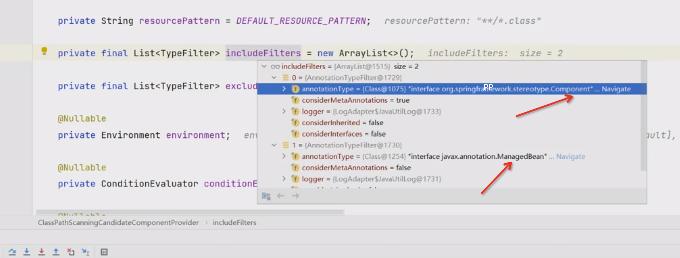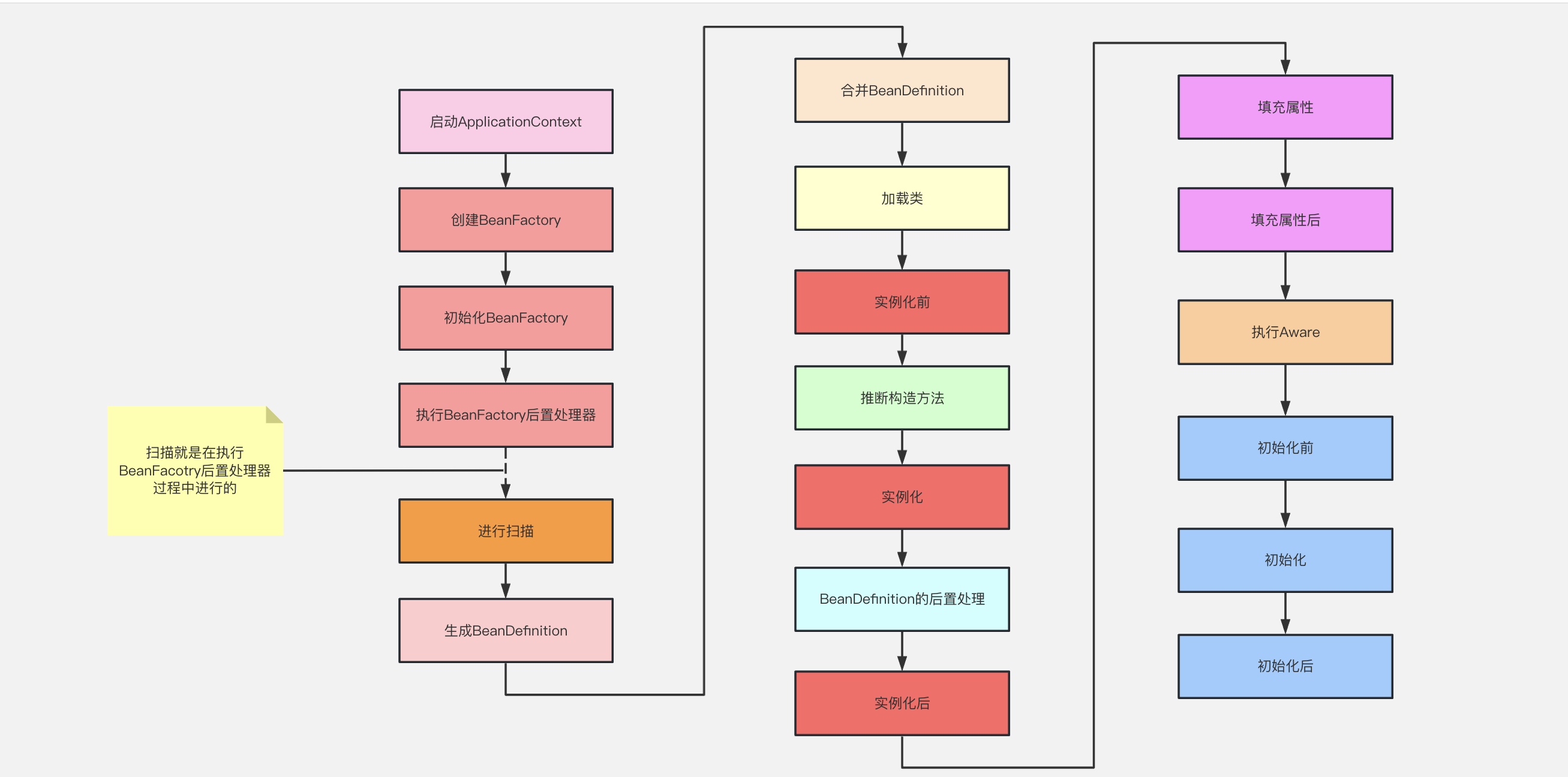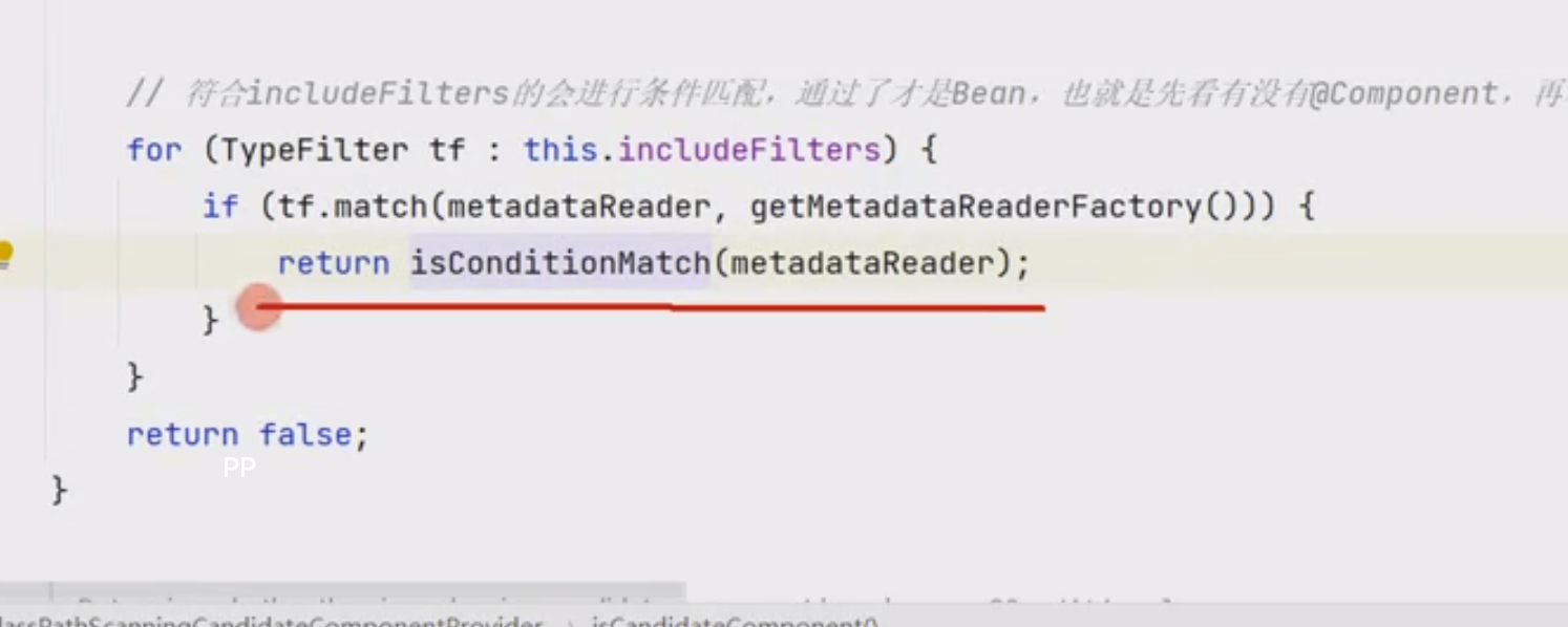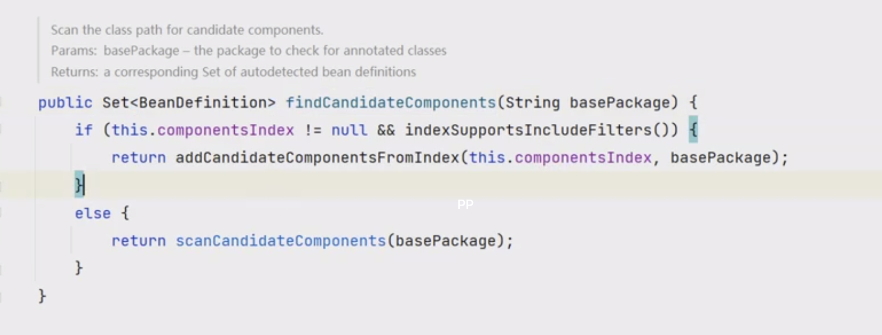 扫描(addCandidateComponentsFromIndex)/(findCandidateComponents)==》拿到所有指定扫描路径下的Resource资源数组(里面都是一个个class文件,Spring源码中将此文件包装成了Resource对象)===》传入Resource获取类的元数据信息===》是否匹配排除过滤器===》是否包含include过滤器(ManagedBean/Components)===》条件匹配(是否有@Conditional注解,调用match方法)==》符合构造sgbd(ScannerGenericBeanDefinition)把注解的元数据赋值metadata,还会设置Resource资源文件,把class这个对象赋值给这个beanClass属性(以上内容都会在构造方法内完成)===》(isCondidateComponent方法)取出sbd中刚设置的类的元数据(注解相关的元数据)还会判断是不是独立的(不是独立的类就不能成为一个bean 静态内部类除外)以及isConcrete是不是一个接口或者抽象类(接口和抽象类都没办法得到一个对象)特殊情况:是抽象类 但是有@Lookup注解===》最终都符合最终加到Set<BeanDefinition> candidates,返回(scanCandidateComponents方法结束)