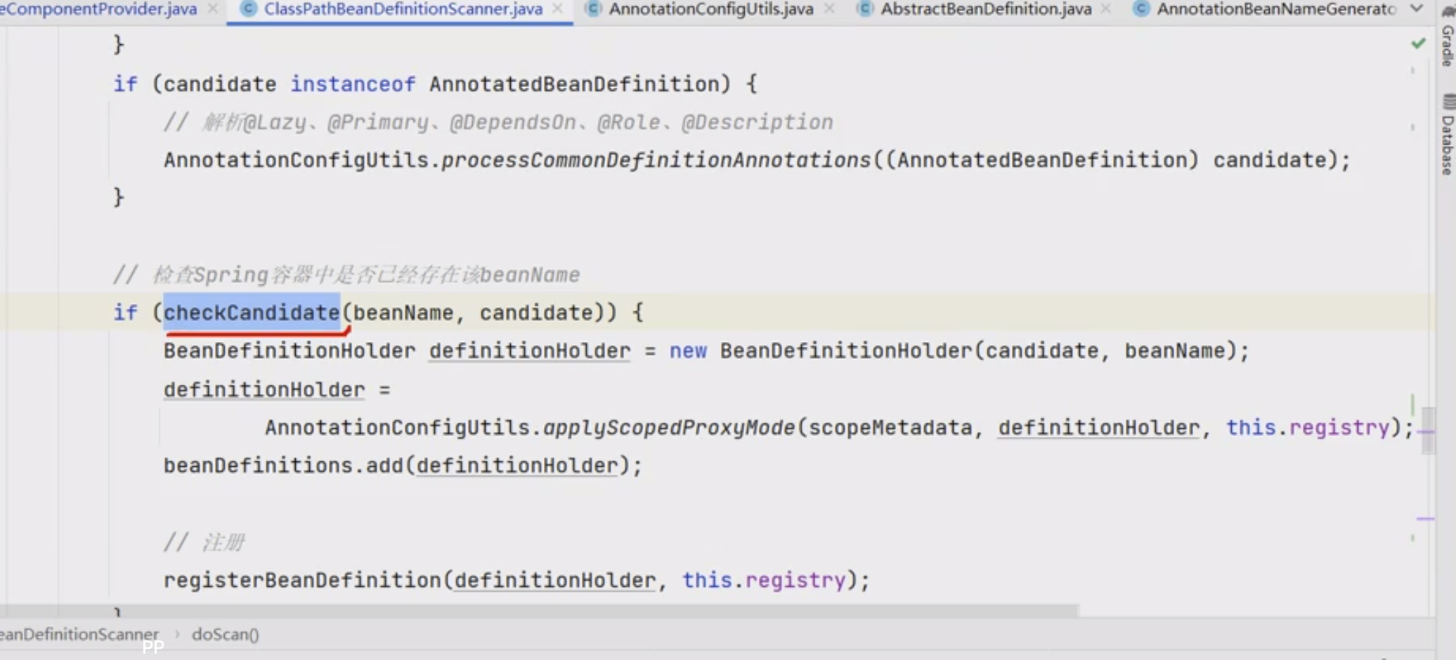 遍历每个Set<BeanDefinition> candidates,解析出scopeMetadata数据,设置进BeanDefinition的scope属性===》生成beanName(有指定直接返回,没有的话首字母小写或前2个字母大写返回)===》给当前beanDefinition赋值一些默认值(销毁方法,懒加载,强制初始化方法)===》解析@Lazy、@Primary、@DepondsOn等注解,设置给BeanDefinition===》检查当前spring容器中是否已经存在该beanName,如果有相同的beanName则会报错抛异常(但是如果Resource资源是一样的则返回false,说明是兼容的),spring容器中不存在该beanName则返回true===》check成功把BeanName和BeanDefinition封装成一个BeanDefinitionHolder对象,加到beanDefinitions,最后拿出BeanDefinition注册到beanDefinitionMap(用到最开始的registry)。