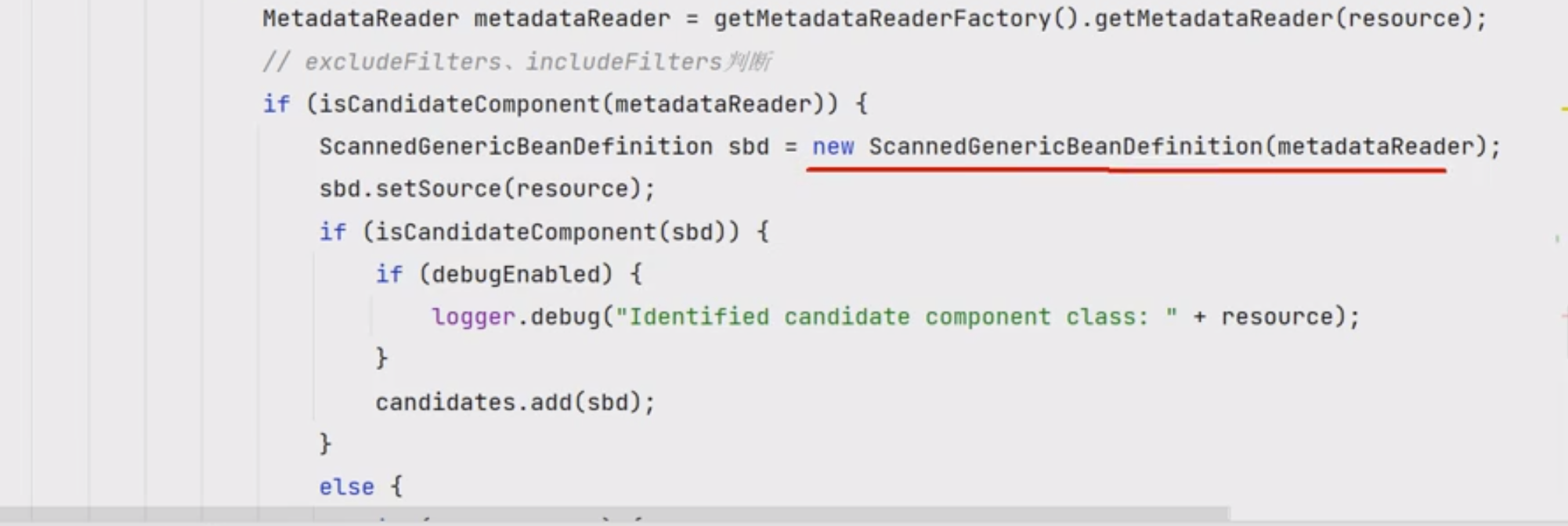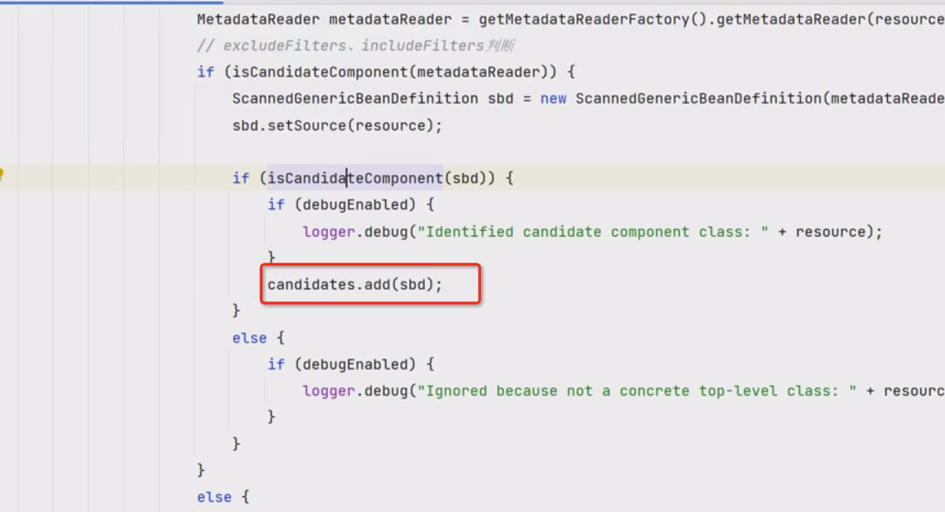 首先获取类的元数据信息。看是否命中排除过滤器,接下来看是否命中include过滤器,有两个注解:Component和ManagedBean?看是否命中条件匹配过滤器,类上是否有@Conditional注解指定了哪个类实现了Condition接口,调用match方法,返回true是一个Bean。接下来会构造扫描一般的BeanDefinition(sgbd),构造方法完成3件事,①取出注解的元数据信息赋值给metaData,②把全类名赋值给beanClass属性,这个是Object类型的,后面完成实例化才会把class对象封装进来,③封装Resource资源。接下来执行isCondidateComponents方法,是否是独立的(静态内部类除外),接口,抽象类(加了@LookUp注解除外)。执行isCondidateComponent(),符合就全部加入到Set<BeanDefinition> condidates里。