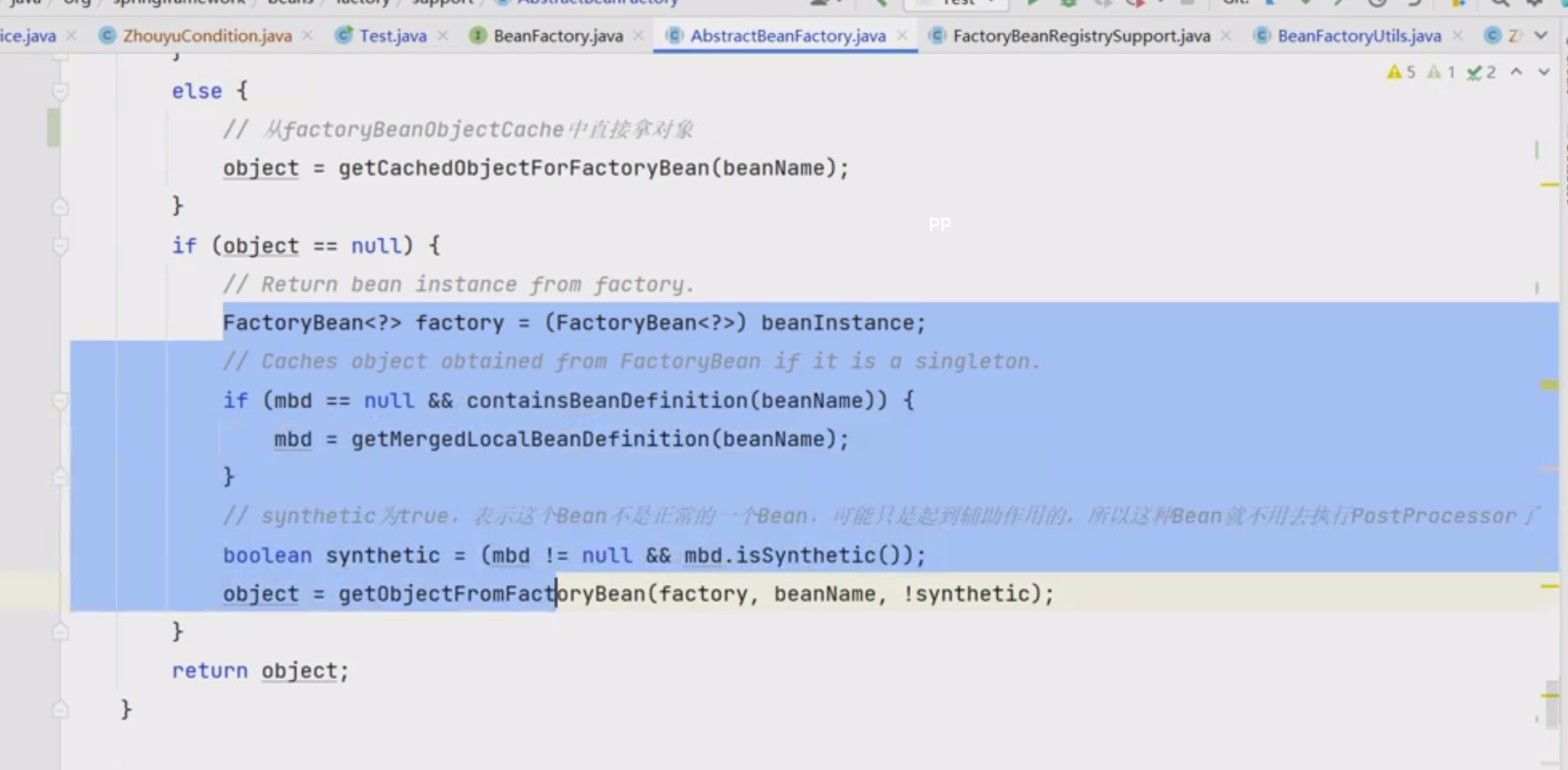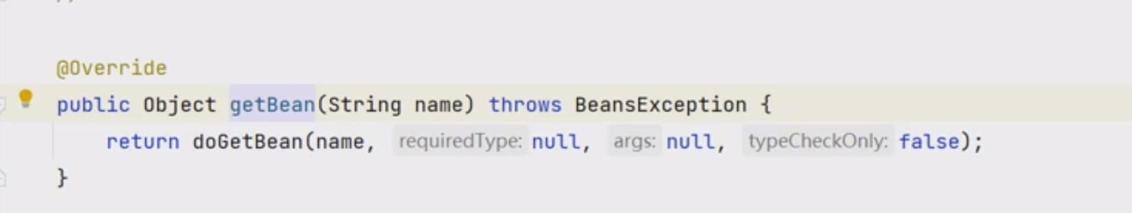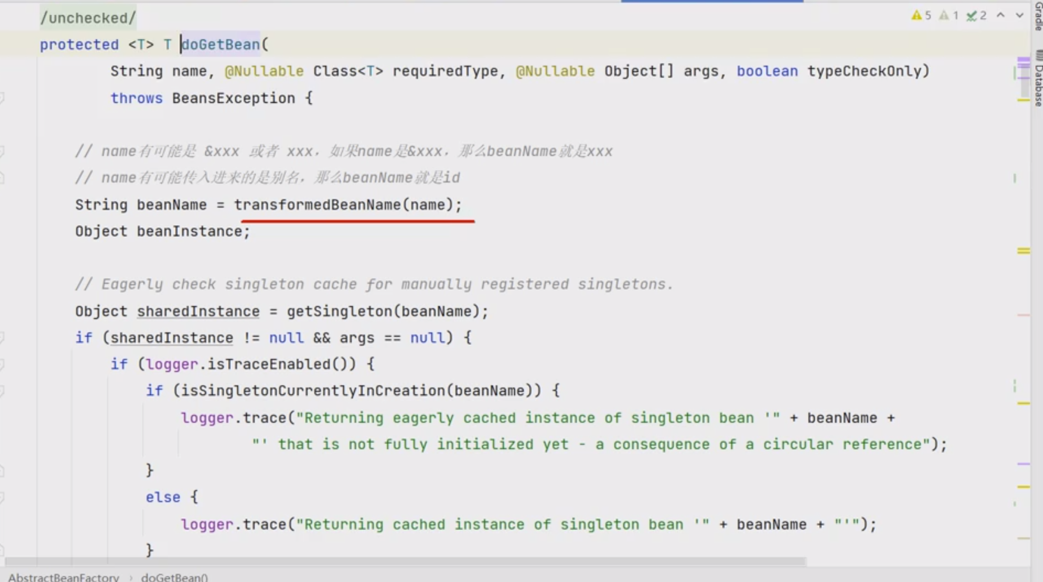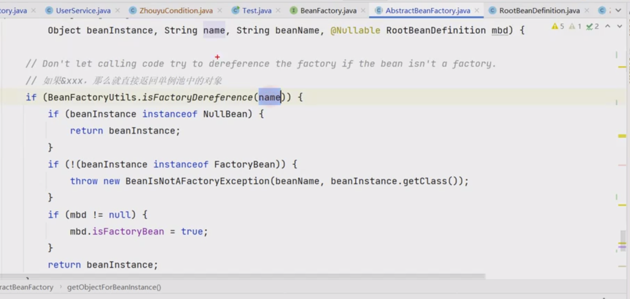 xxxFactoryBean是存在单例池里的,但是单例池里的xxxFactoryBean它的key是不带&的,所以这个方法会处理掉“&”这个符号,一堆“&”底层也用的while处理掉,然后再通过getSingleton(beanName)方法拿到xxxFactoryBean对象,如果不带“&”就直接返回,