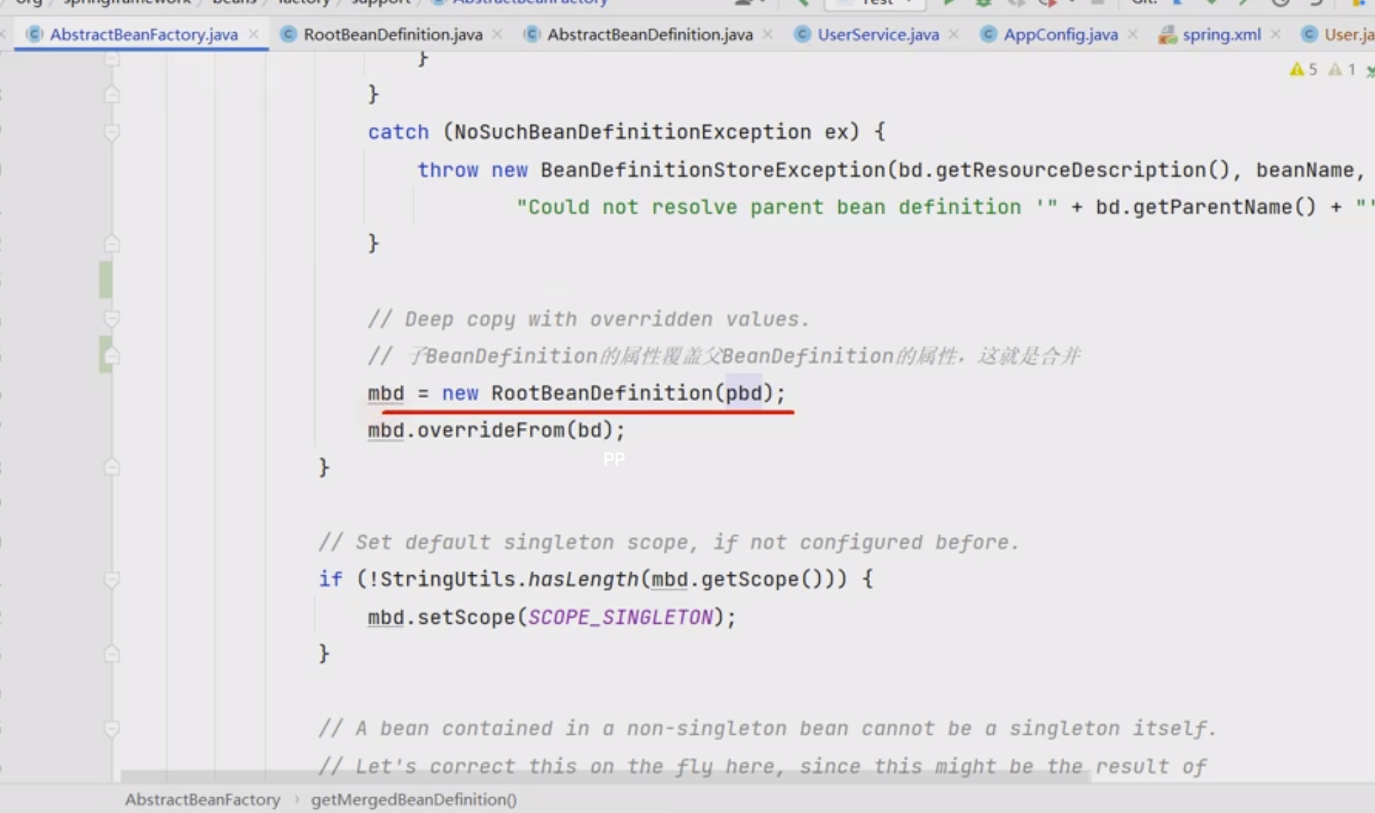 合并之后的BeanDefinition。合并会生成第三个BeanDefinition对象的,不能直接修改,因为父亲不只给一个人用,其他人还要用。不一定是要抽象的BeanDefinition才能成为parent,普通的BeanDefinition也能成为父亲