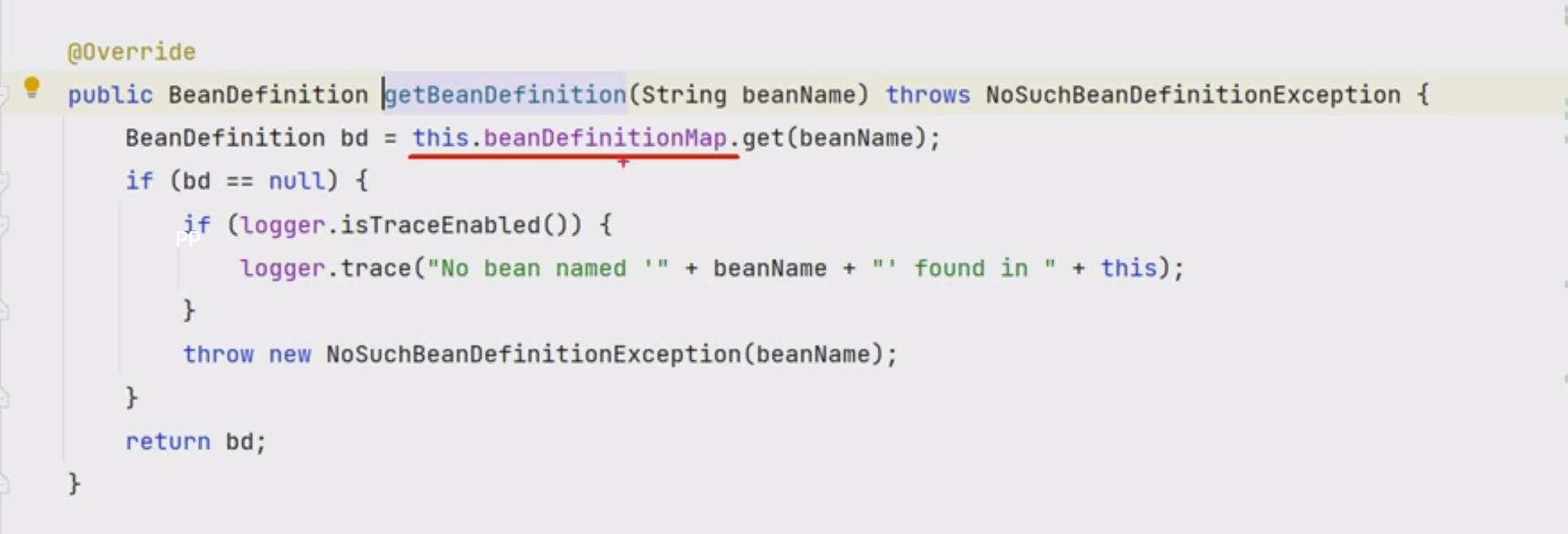 先根据beanName从BeanDefinitionMap中拿到BeanDefinition返回(此时是没有合并的)