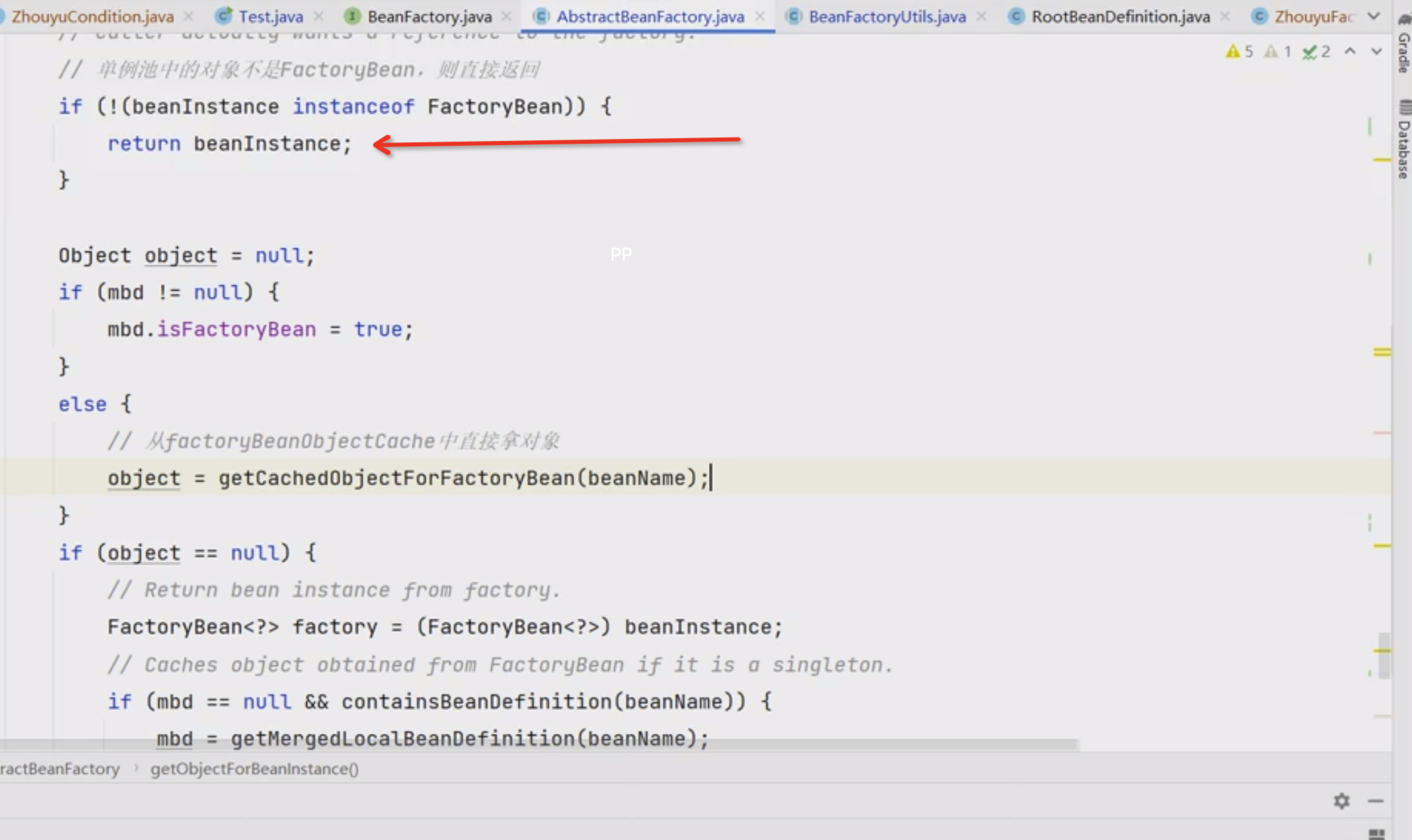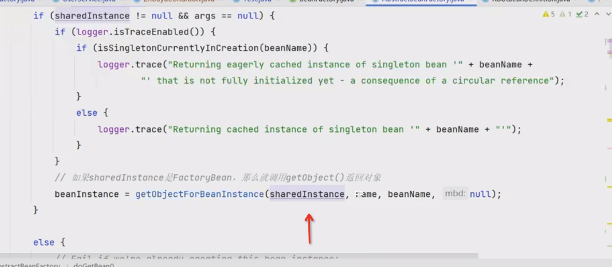 如果传的name带了"&"符号,从单例池拿出来的不是xxxFactoryBean是有问题的,如果是就直接返回。