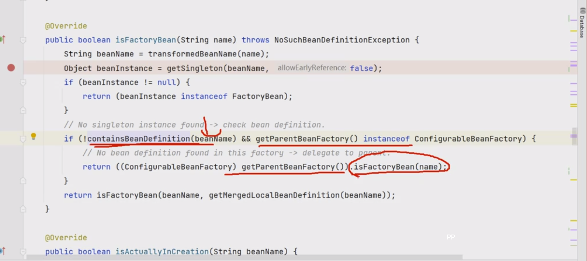 拿不到的话,只能通过基于BeanDefinition去判断是不是FactoryBean,如果本容器没有BeanDefinition,就会看有没有父BeanFactory再调用父亲的isFactoryBean
