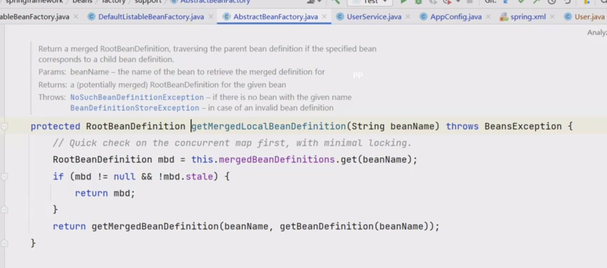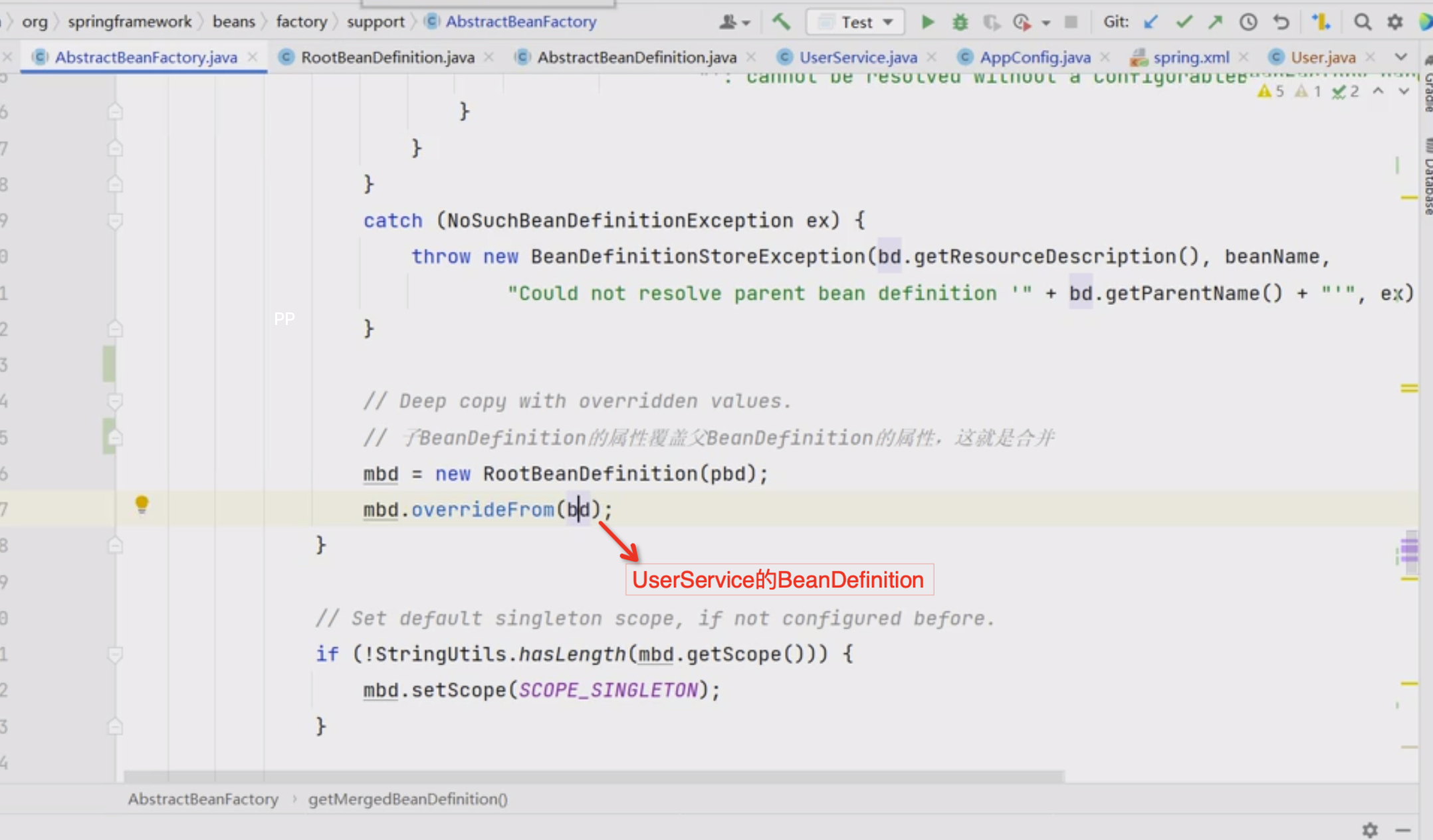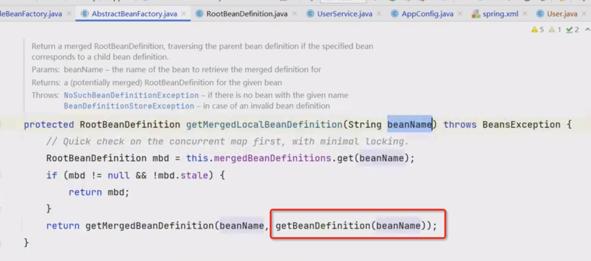 根据beanName获取合并后的BeanDefinition,把内部的属性和parent的进行合并,如果自己定义了就用自己的,自己没定义用的就是父亲的。RootBeanDefinition