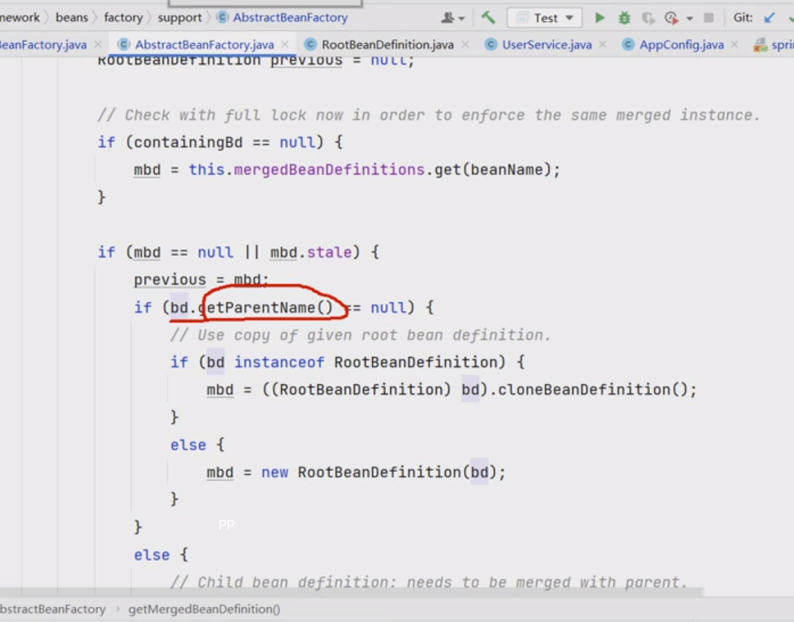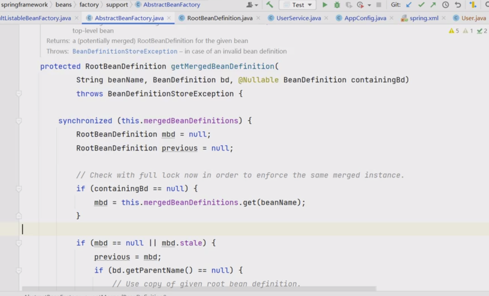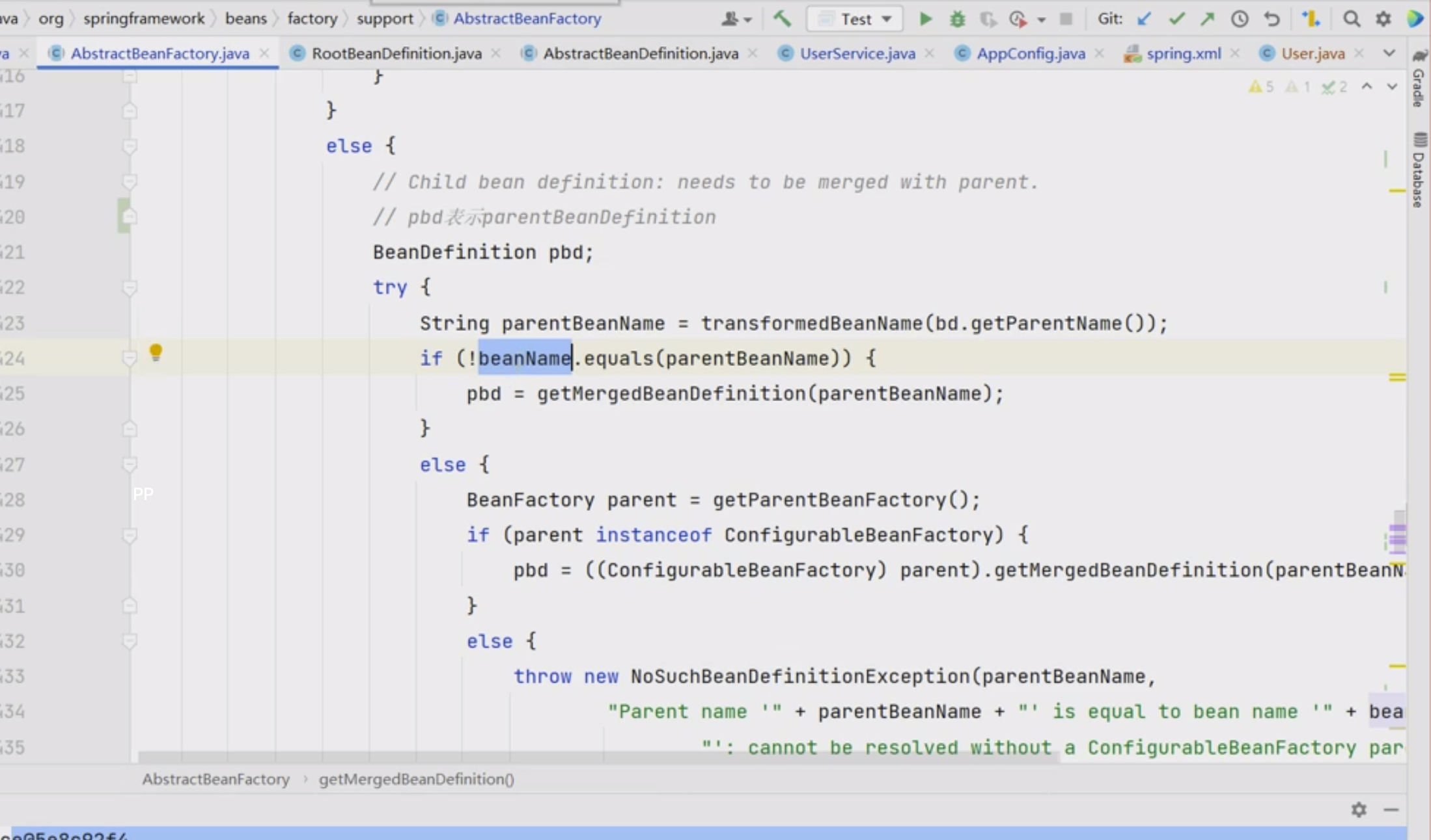 根据beanName获取合并后的BeanDefinition,把内部的属性和parent的进行合并,如果自己定义了就用自己的,自己没定义用的就是父亲的。RootBeanDefinition