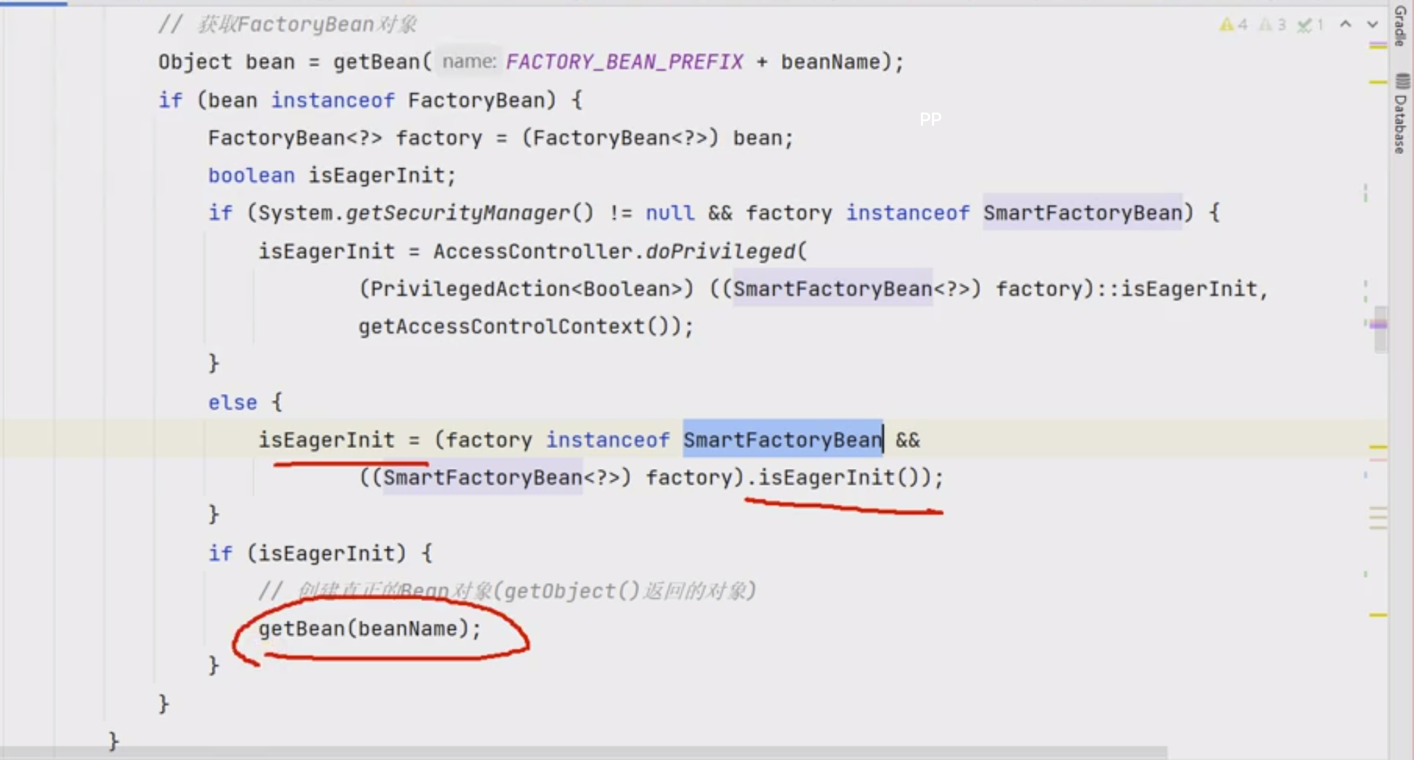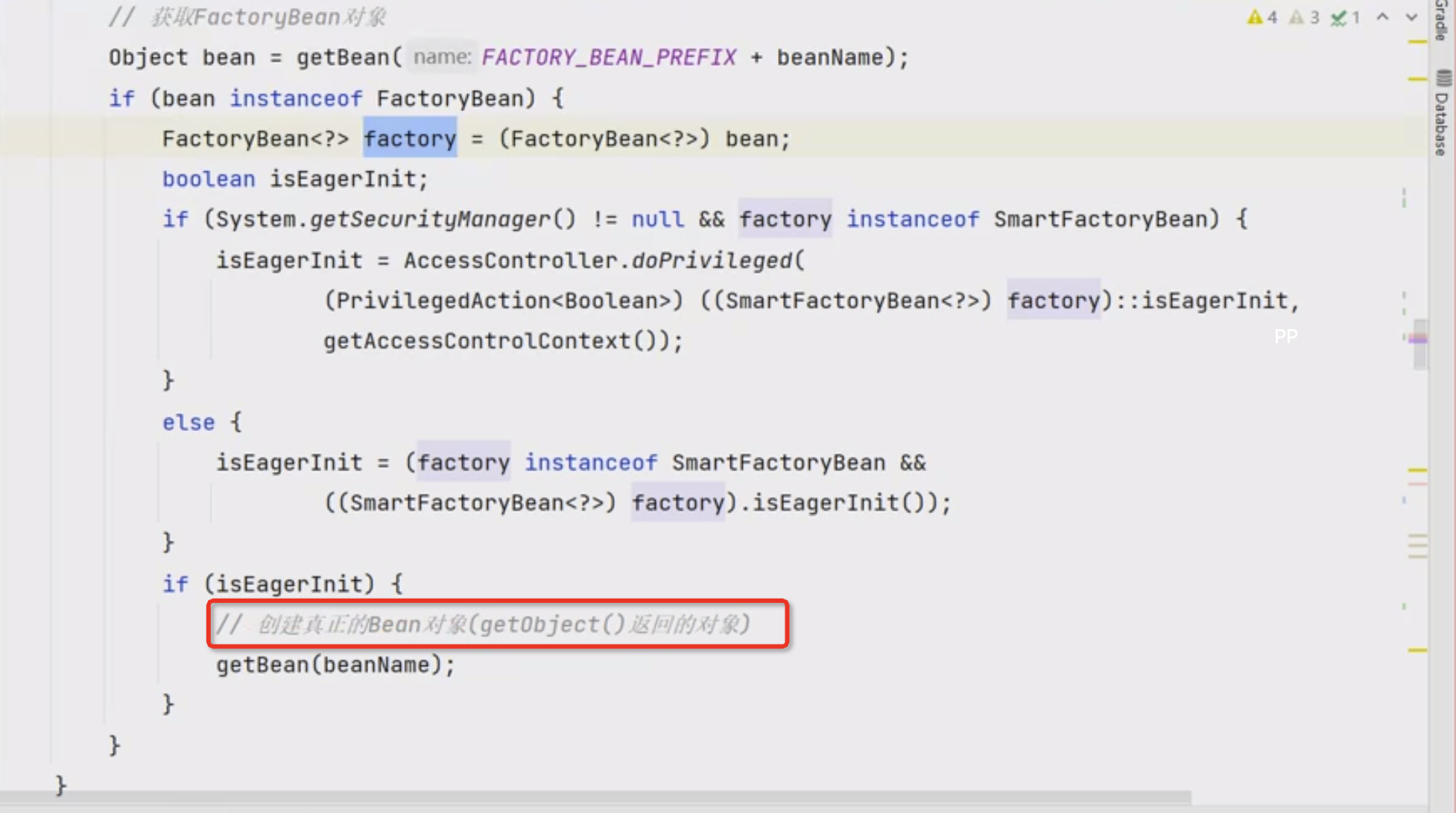 如果是==》根据beanName去判断是否是FactoryBean的,首先会从单例池中通过beanName拿到(存放的就是FactoryBean的实现类),如果拿不到的话,就会(基于BeanDefinition做一个类型推断,如果当前beanName拿不到BeanDefinition,则会去父BeanFactory里去找),①通过beanClass拿到全类名,然后看是否实现了FactoryBean接口。beanName前加上&符号,创建xxxFactoryBean对象,②判断是否实现了SmartFactoryBean接口,重写了isEagerInit方法返回的是true,如果是name在spring容器启动的时候就会创建这个getObject()返回的对象。===》如果返回了true,这时候就会去创建真正的bean对象,如果此时getBean(createBean)的beanName传的是带"&"名字,希望得到的是xxxFactoryBean对象,如果不带“&”则希望是getObject()方法返回的对象,因为xxxFactoryBean是存在单例池里的,但是单例池里的xxxFactoryBean它的key是不带&的,所以这个transformBeanName方法会处理掉“&”这个符号,一堆“&”底层也用的while处理掉,然后再通过getSingleton(beanName)方法拿到xxxFactoryBean对象,如果不带“&”此时就直接返回,然后调用getObjectForBeanInstance(),这里参数会传入两个名字,"name:&xxx"和“beanName:xxx”,如果传的name带了"&"符号,就直接从单例池中取出返回。如果不带&说明我想拿的就是getObject()方法返回的对象,先从缓存拿,一开始缓存是空,走下面的逻辑,直接调用getObject方法得到对象。