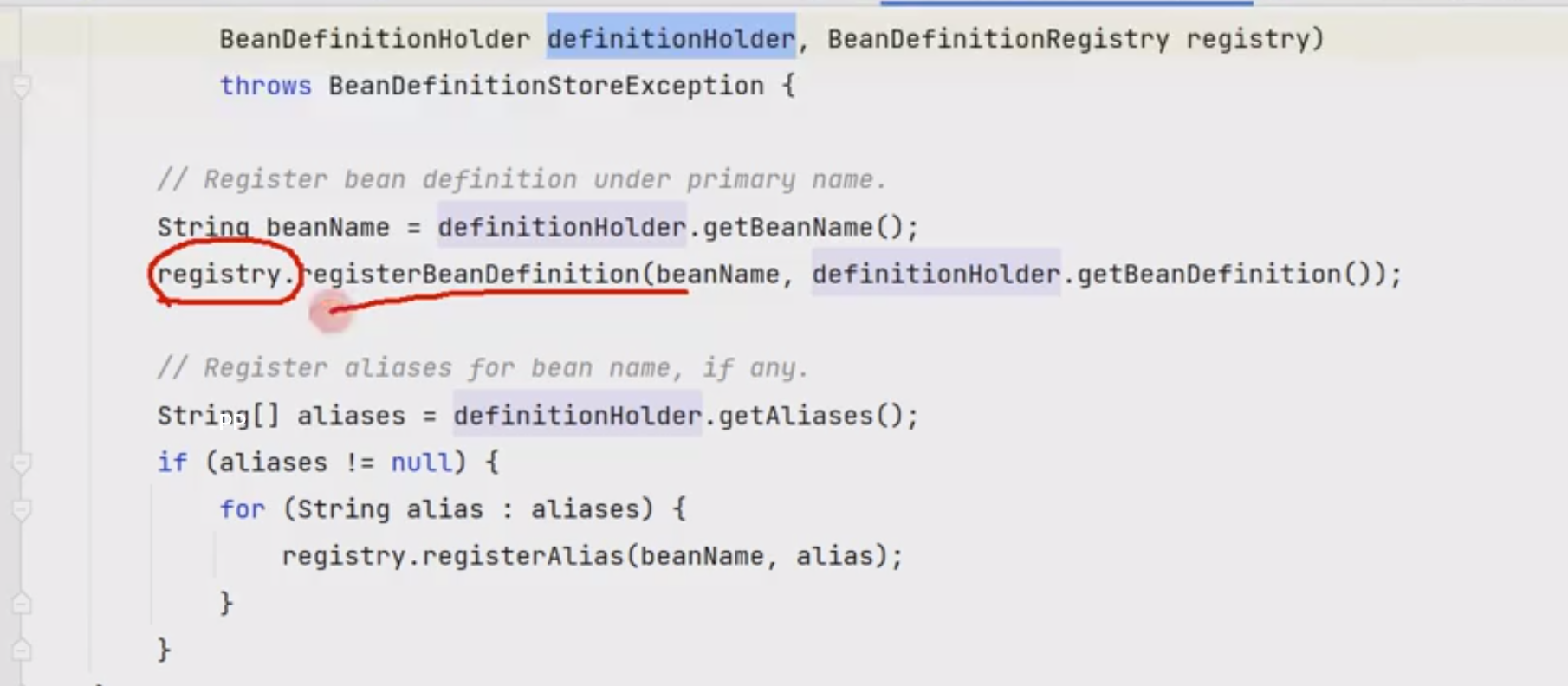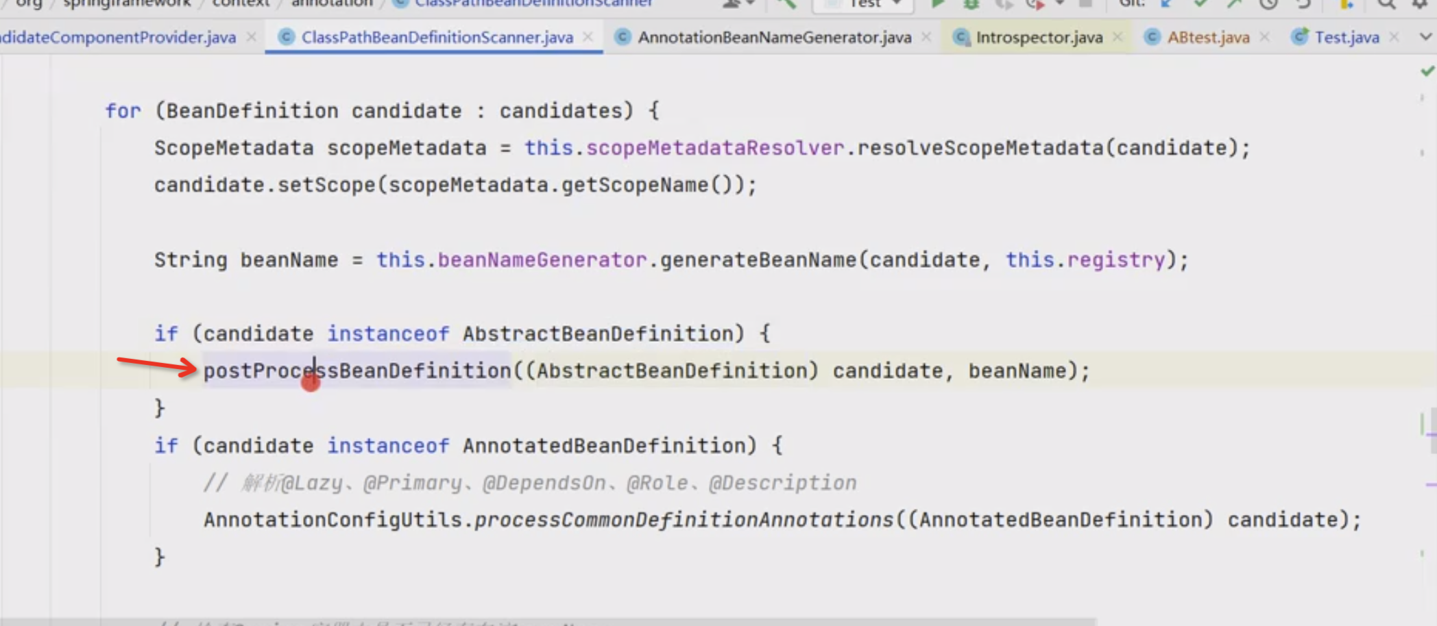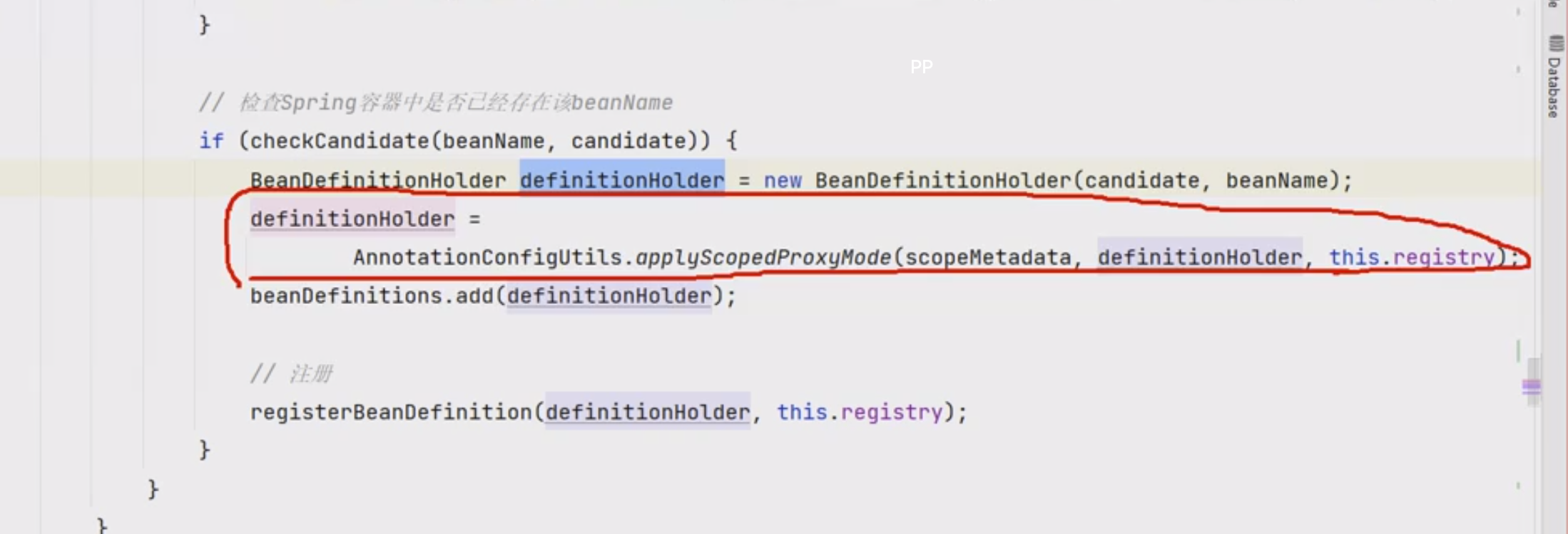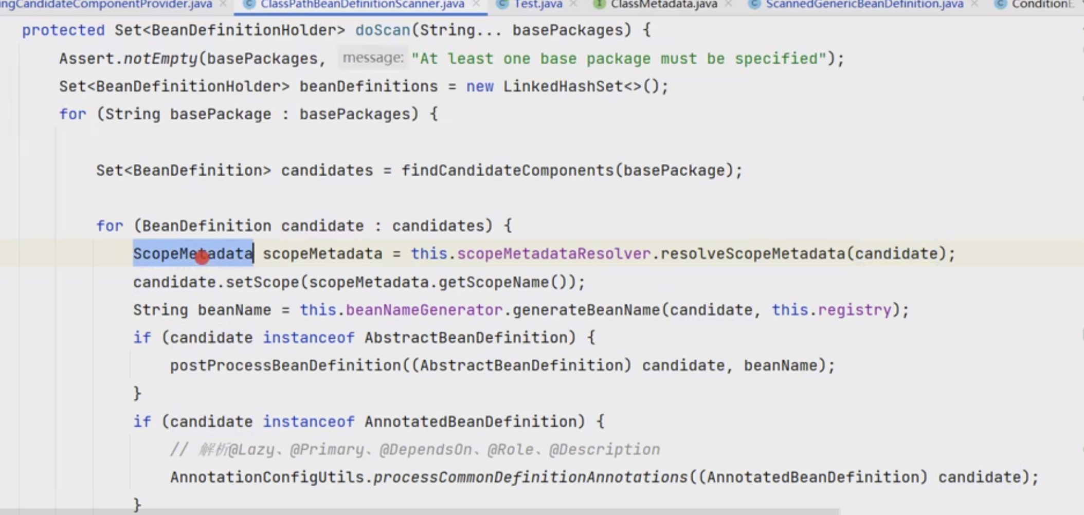 遍历condidates解析Scope的元数据信息,赋值给当前BeanDefinition。赋值BeanName(如果有指定),完成默认值的赋值,强制初始化,懒加载,销毁方法等,看是否有@Lazy,@DependsOn,@Primary注解等,赋值给BeanDefinition。Check检查当前BeanName对应的BeanDefinition是否存在于容器中,如果有抛异常,但是如果Resource一致就认为是兼容的。check成功根据BeanName和BeanDefinition封装成Holder对象,然后通过Register加入到BeanDefinitionMap里。