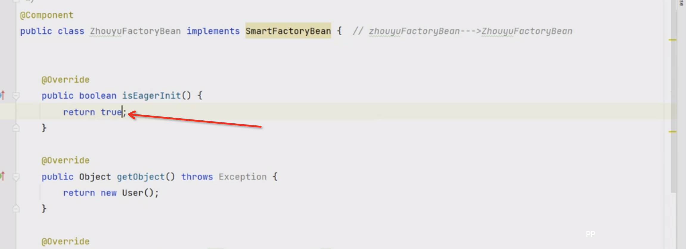 如果实现了SmartFactoryBean接口且重写了isEagerInit()返回了true,就会在spring启动的时候生成User对象
