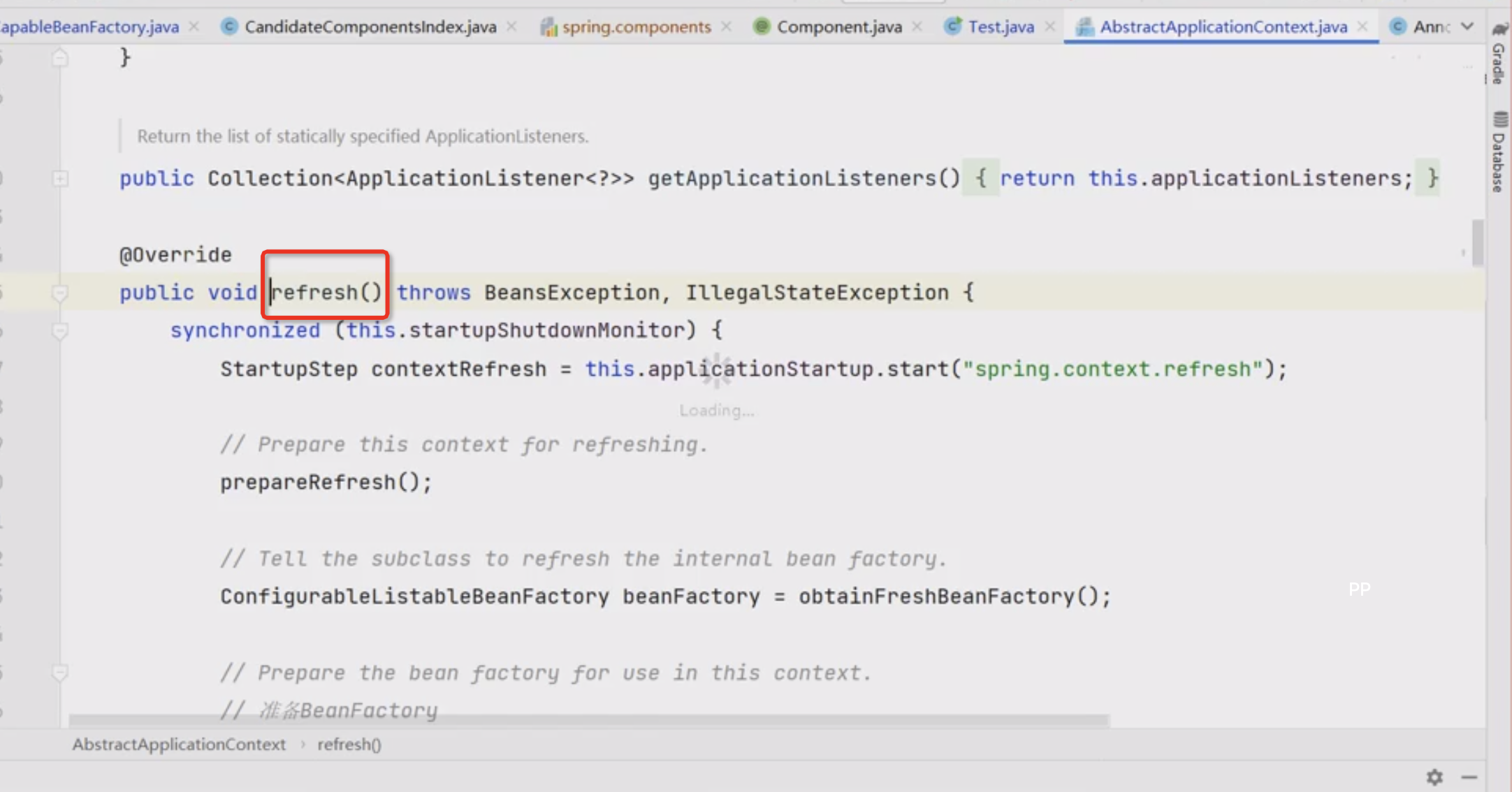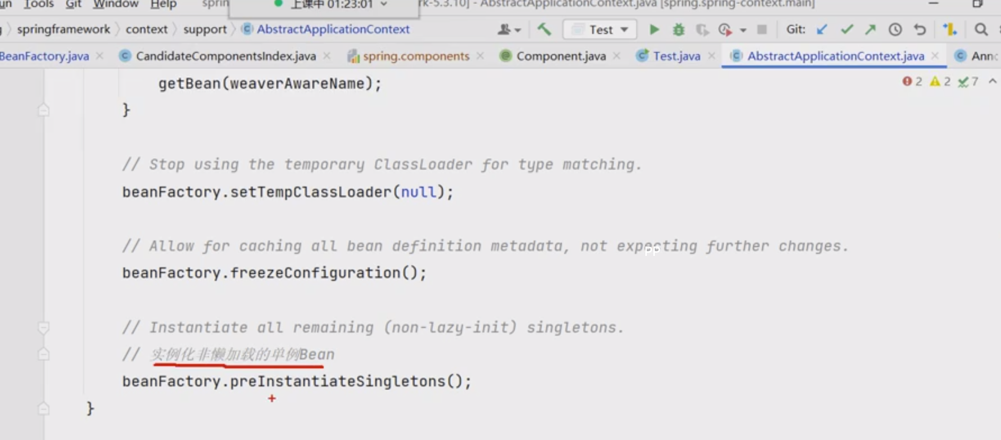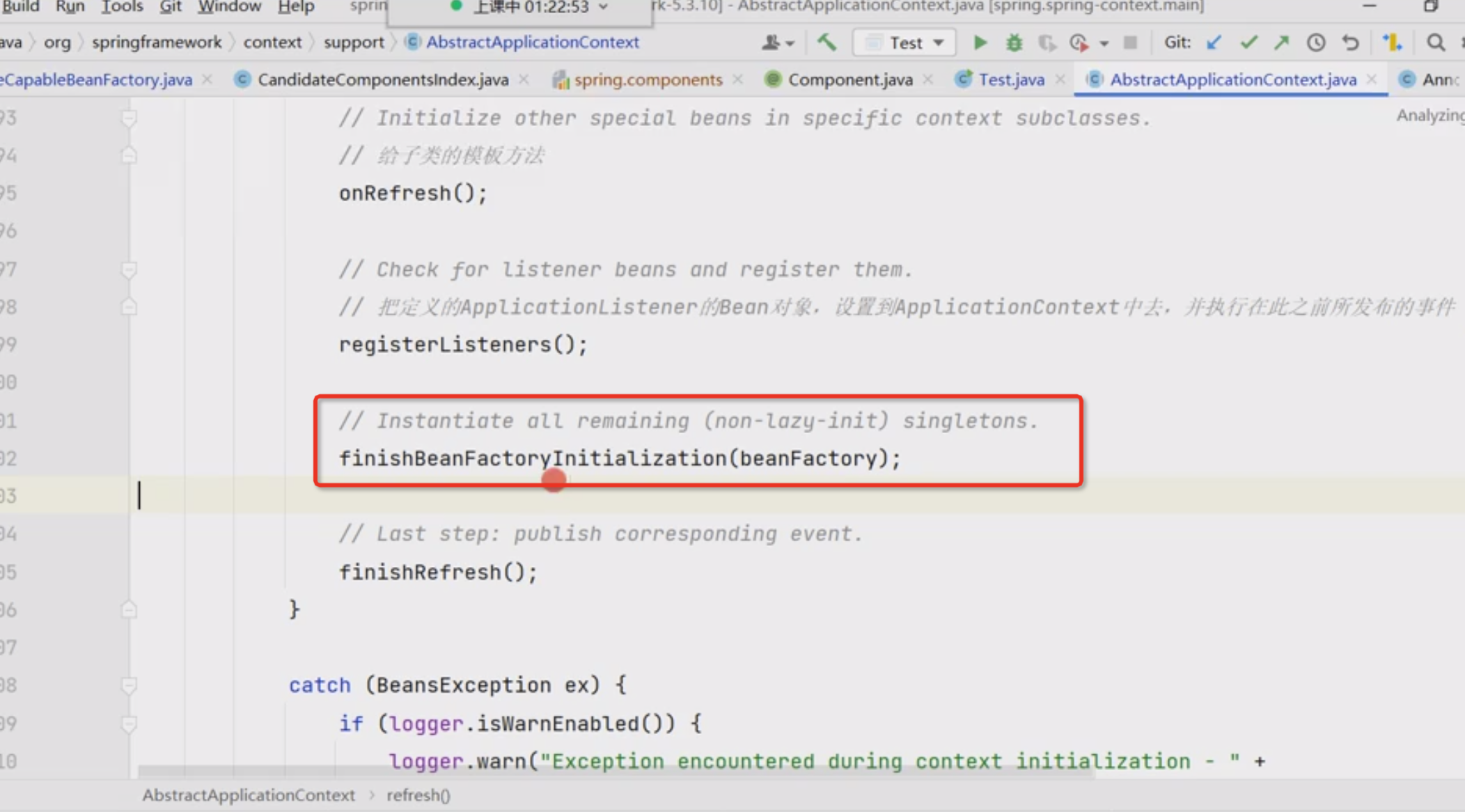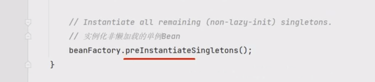 在refresh()方法里有个完成Bean工厂初始化的方法上面有个方法