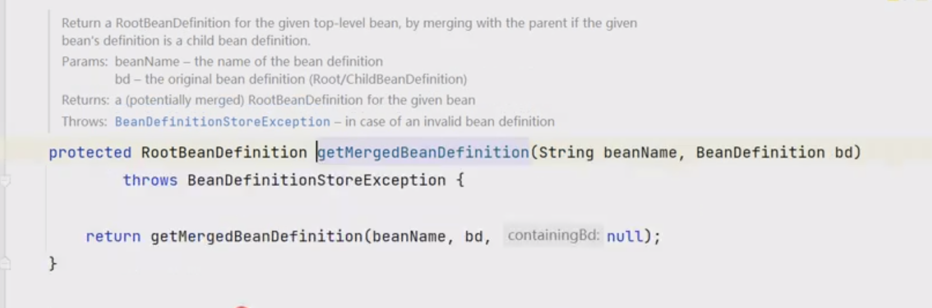 然后会调用getMeregedBeanDefinition方法,第三个参数是null