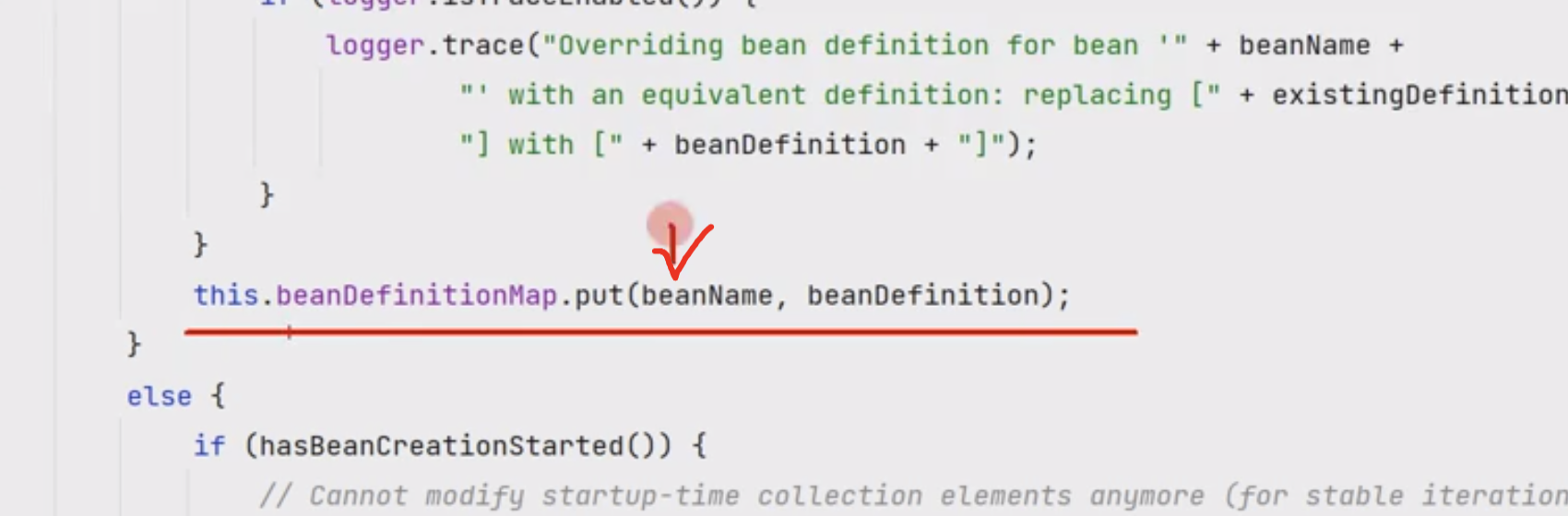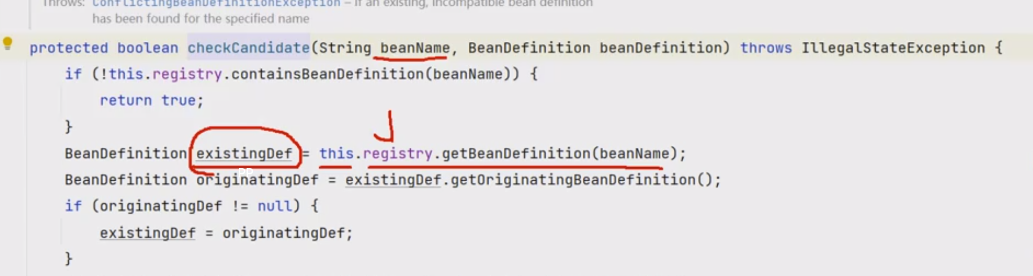 检查Spring容器中是否已经存在该beanName,传入beanName和当前对应BeanDefinition。