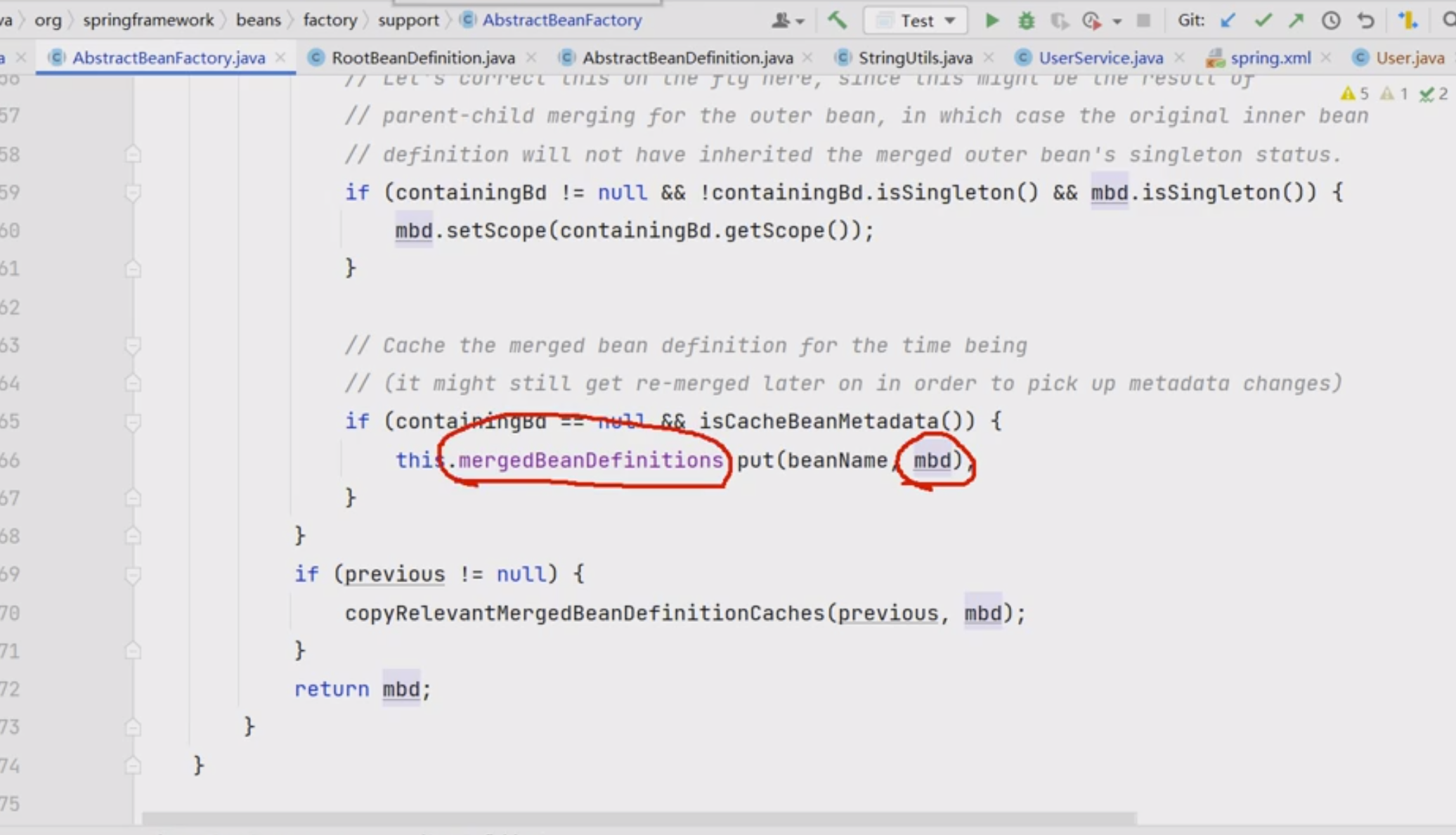 所以合并好的RootBeanDefinition就会存到mergedBeanDefinitions。