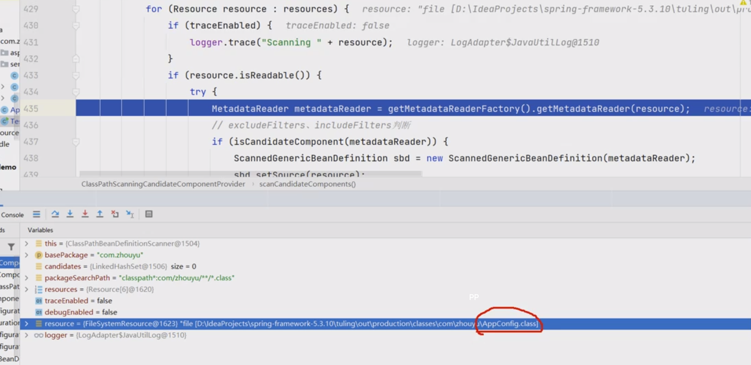当前处理的是AppConfig.class,传进去就能得到元数据读取器,就可以读取类的信息啊,注解啊,是不是抽象类啊,父类啊之类的。底层用的ASM技术