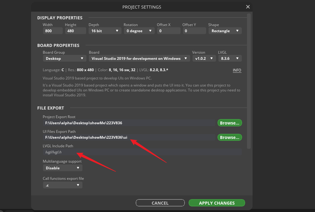- 此处可配置 UI 源码的导出路径,以及 lvgl 头文件