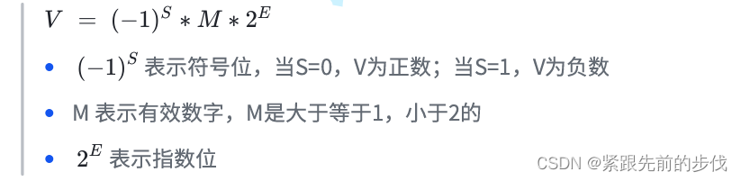 举例来说: ⼗进制的5.0,写成⼆进制是 101.0 ,相当于 1.01×2^2 。 那么,按照上⾯V的格式,可以得出S=0,M=1.01,E=2。 ⼗进制的-5.0,写成⼆进制是-101.0 ,相当于-1.01×2^2 。那么,S=1,M=1.01,E=2。