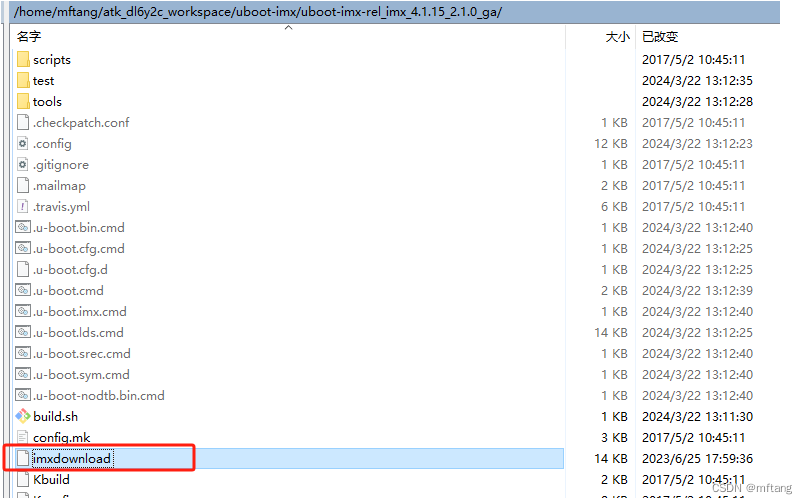 将 imxdownload 软件拷贝到 uboot 源码根目录下,然后使用 imxdownload 软件将 u-boot.bin 烧写到 SD 卡中,在u-boot的目录中看见如下文件