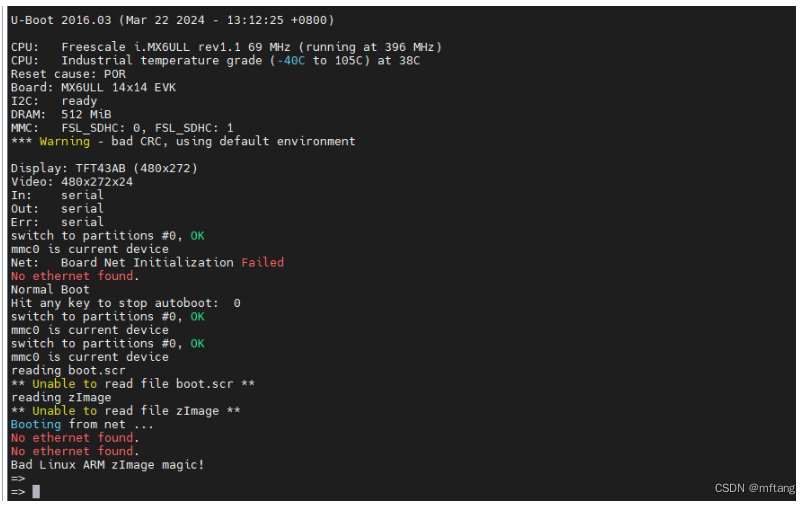 NXP 官方 I.MX6ULL EVK 开发板的 uboot 在ATL-DL6Y2C EMMC 版本 I.MX6ULL 开发板上的运行情况: