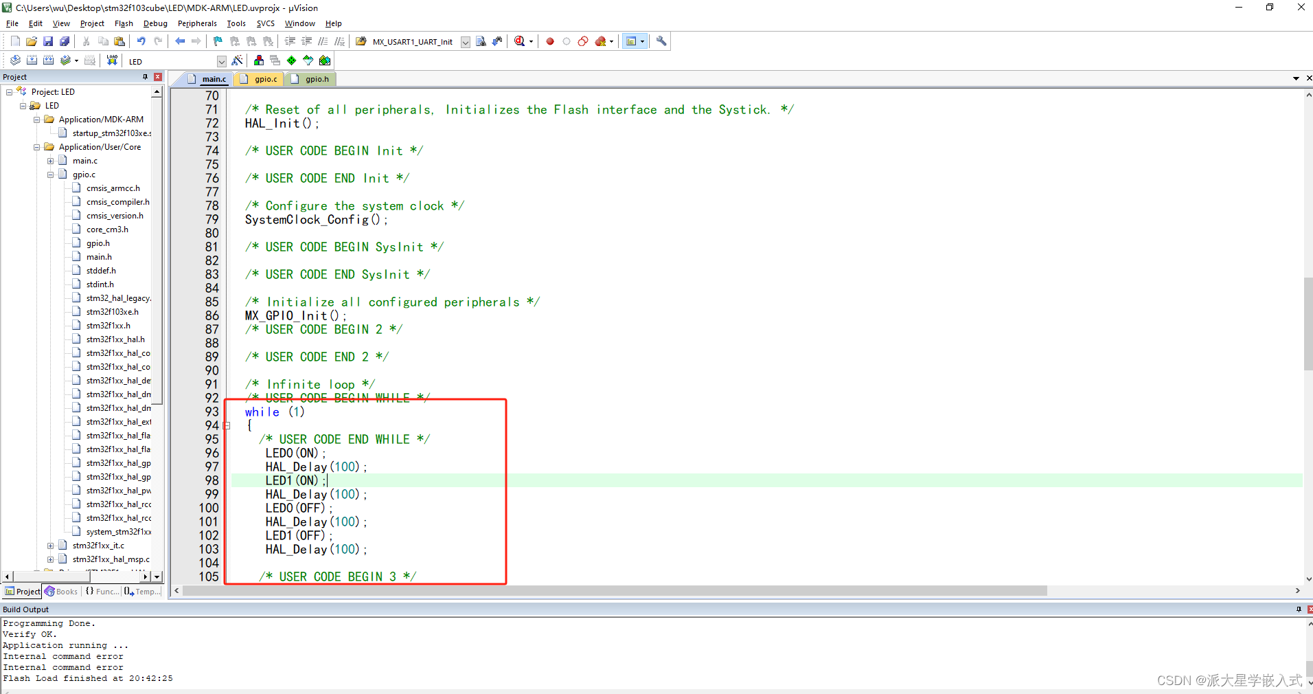 主函数while(1)死循环里面的代码实现了灯的闪烁