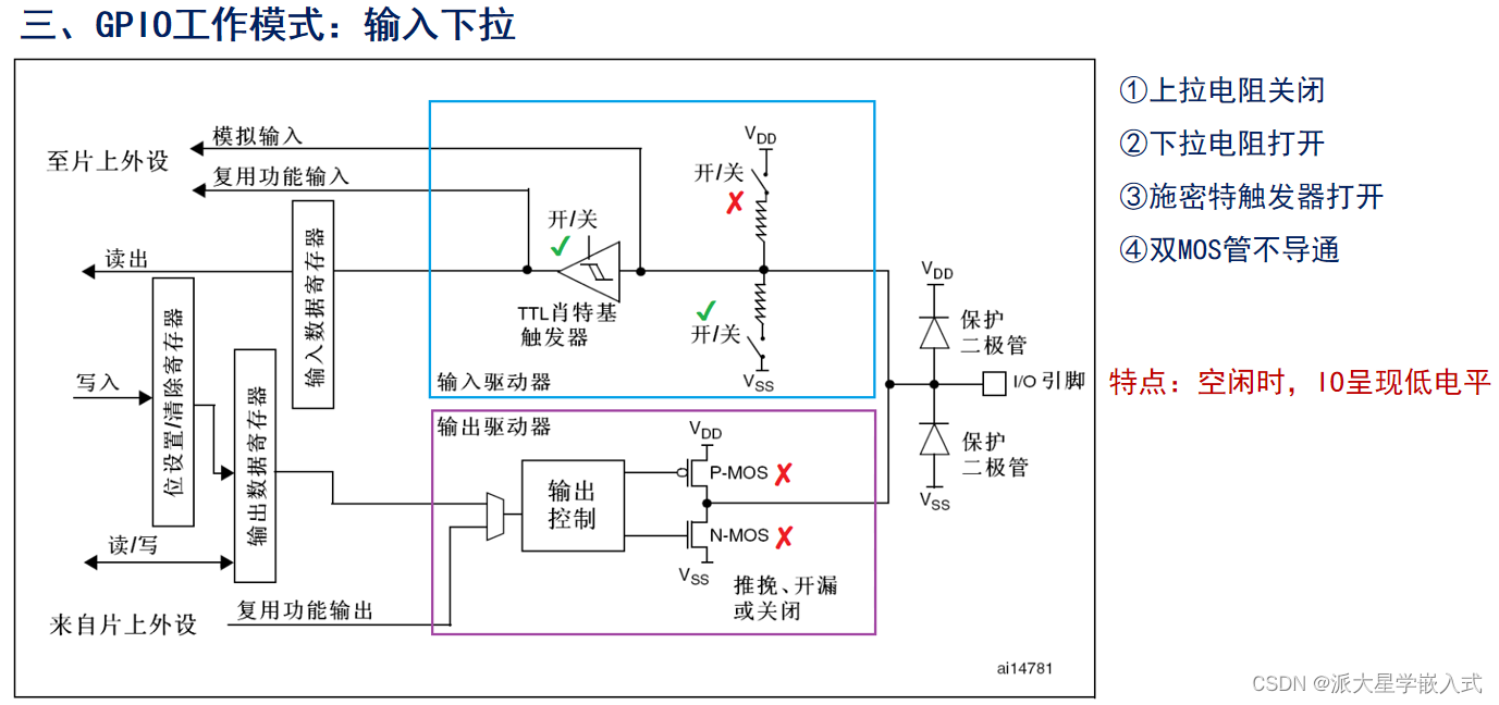 这里如果设置是下拉,空闲的时候因为下拉电阻的打开下接了VSS是低电平