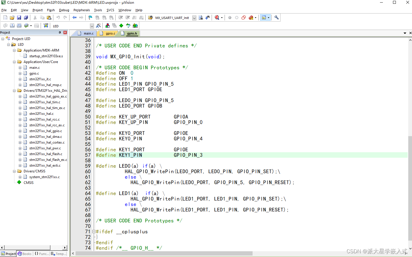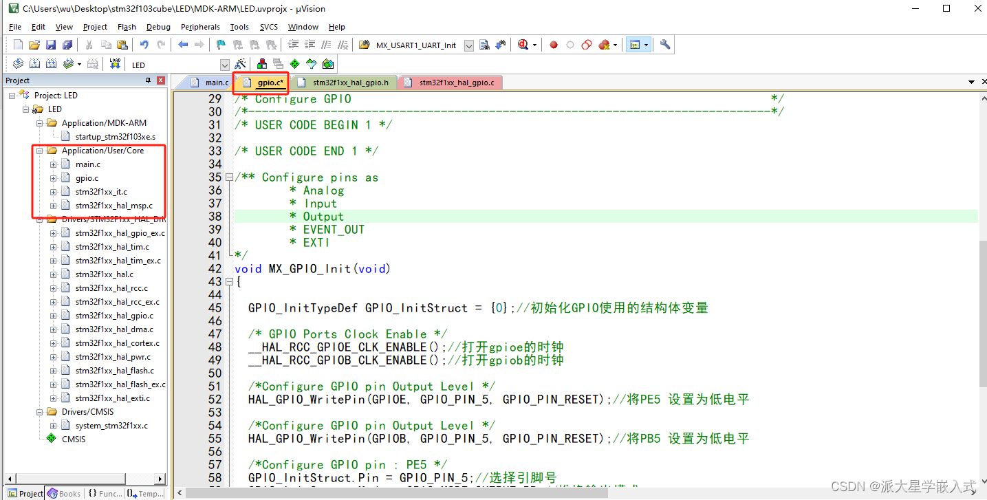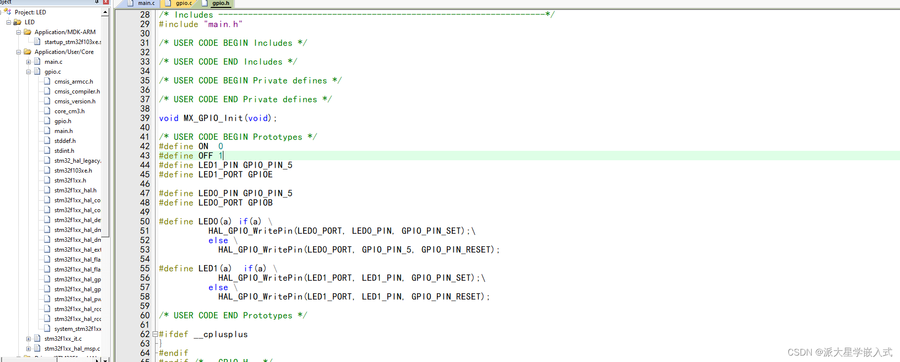 这里我们打开gpio.c 可以看到相关的代码,这里我们根据代码的顺序涉及到的知识,一个一个描述,会涉及的有点多。