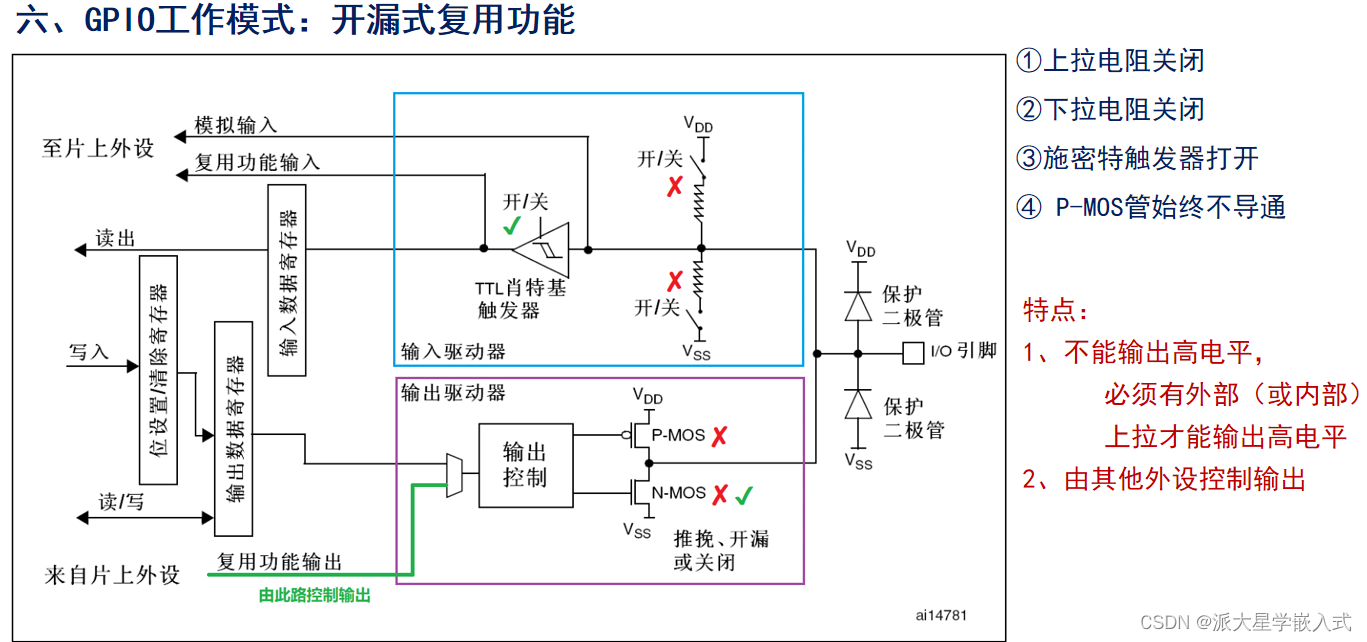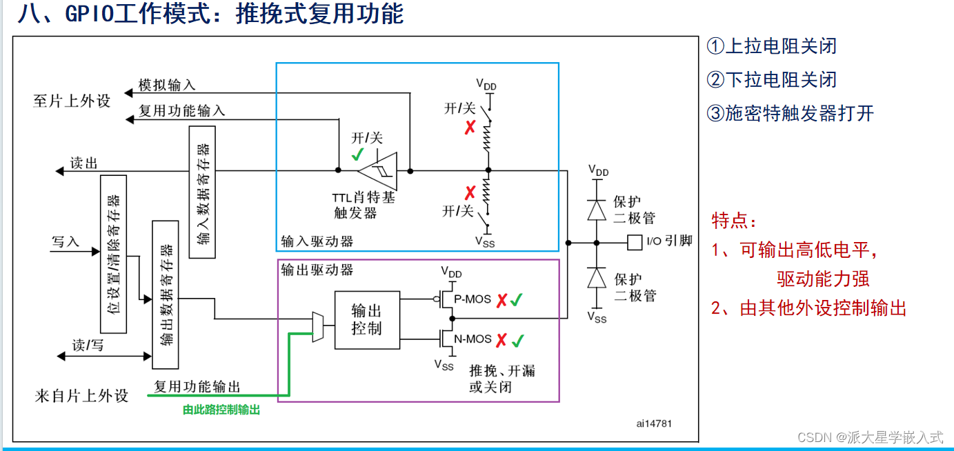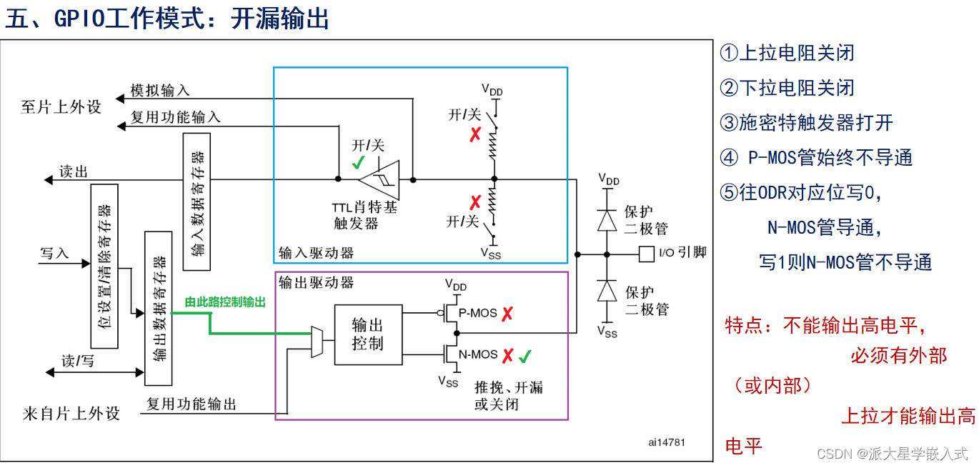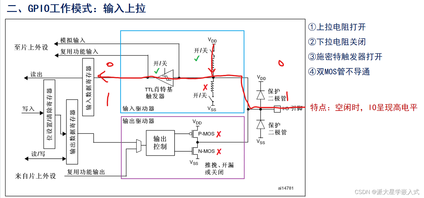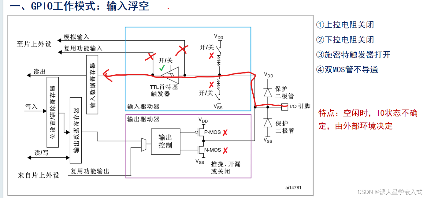 这里是不通过任何的上下拉,走向如图直接IO引脚到输入寄存器IDR