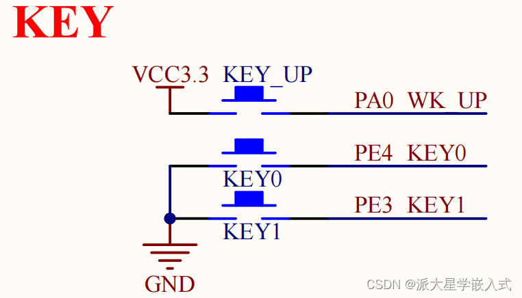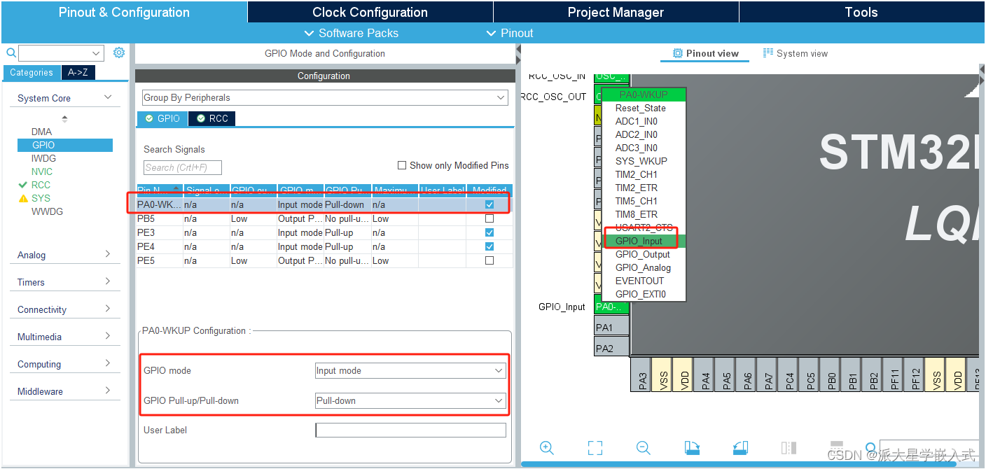 这里我们看原理图当按键没有按下的时候,电平不确定,是高阻态。当按键按下的时候PA0是高电平,我们需要将PA0设置为俩种状态来区分是否按键按下,已知按下是高电平 所以我们需要设置为下拉输入,按键不按下的时候是低电平