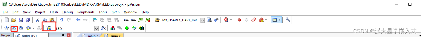 到这里GPIO对应的引脚就初始化完成了,这里我们还没有编写主函数的代码,但是我们已经通过HAL_GPIO_WritePin函数将俩个函数的引脚设置为低电平了,根据一分析原理图的时候,知道将引脚设置为低电平的时候电路就导通了,LED会亮,我们来烧录一下试试