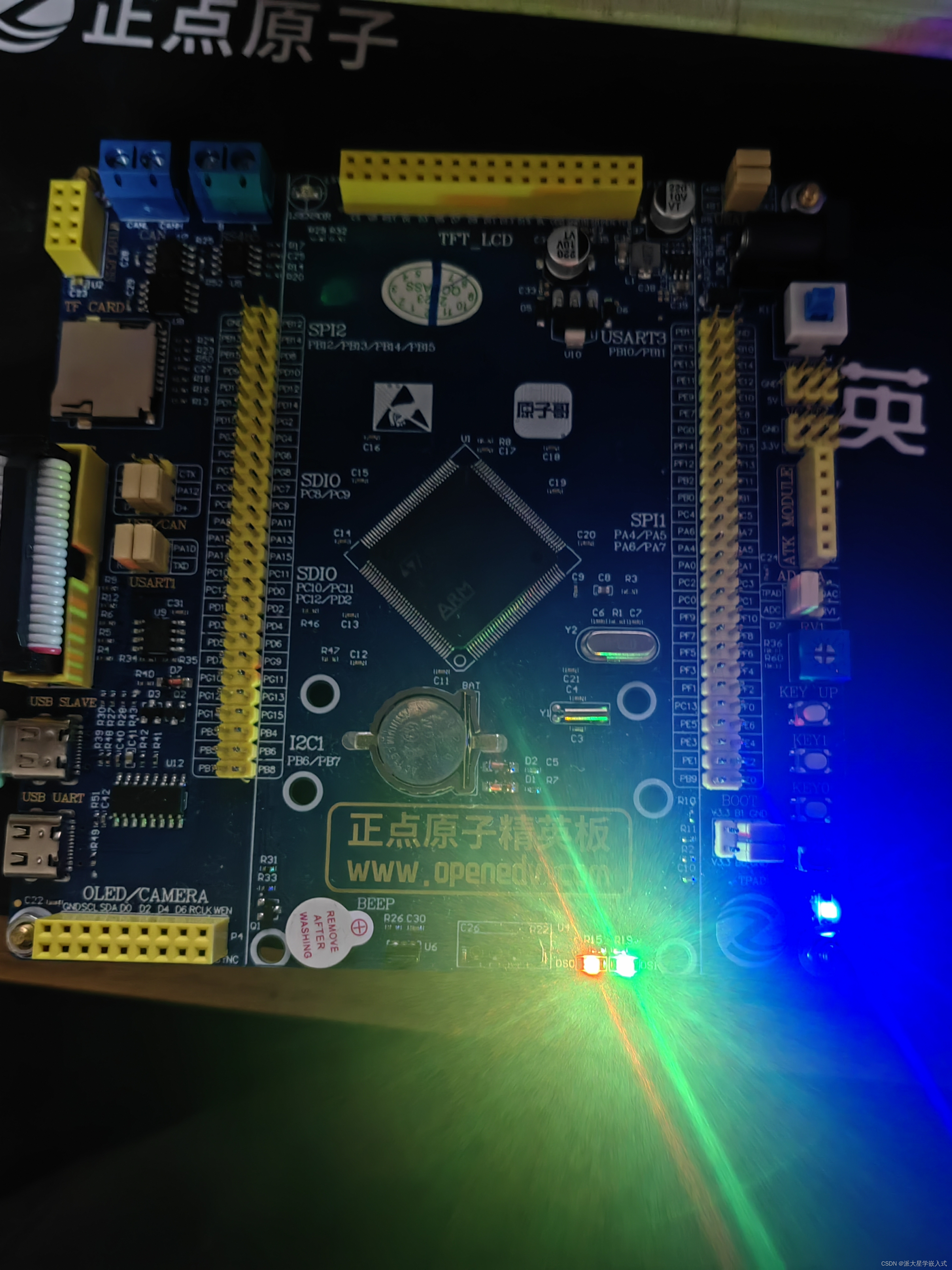灯是亮的,我们这里已经完成了最初的目的,这里我们在主函数里面添加代码来实现流水灯的效果,并通过#define 来封装一下相关引脚 方便移植