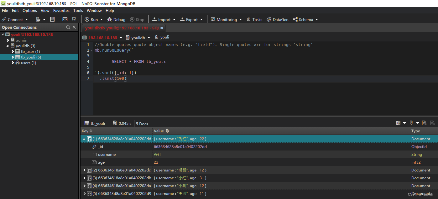use youlidb db.createUser({"user":"youli","pwd":"youli","roles":[{"role":"dbOwner","db":"youlidb"}]}); db.tb_youli.insert({username:'李四',age:11}) db.tb_youli.insert({username:"小明",age:12}) db.tb_youli.insert({username:"小红",age:31}) db.tb_youli.insert({username:"明凯",age:12}) db.tb_youli.insert({username:"秀红",age:22}) db.tb_youli.find() -- 查询所有数据 # 查看数据库 show dbs # 创建的数据库名称youli use youli # 查看数据表(集合) show collections # 检索表中的所有数据 db.tb_user.find() # 新建数据表、插入数据 db.tb_youli.insert({username:'李四',age:11}) # 删除数据表 db.tb_youli.drop() # 删除数据库 db.dropDatabase()2.3 SQL执行效果示例